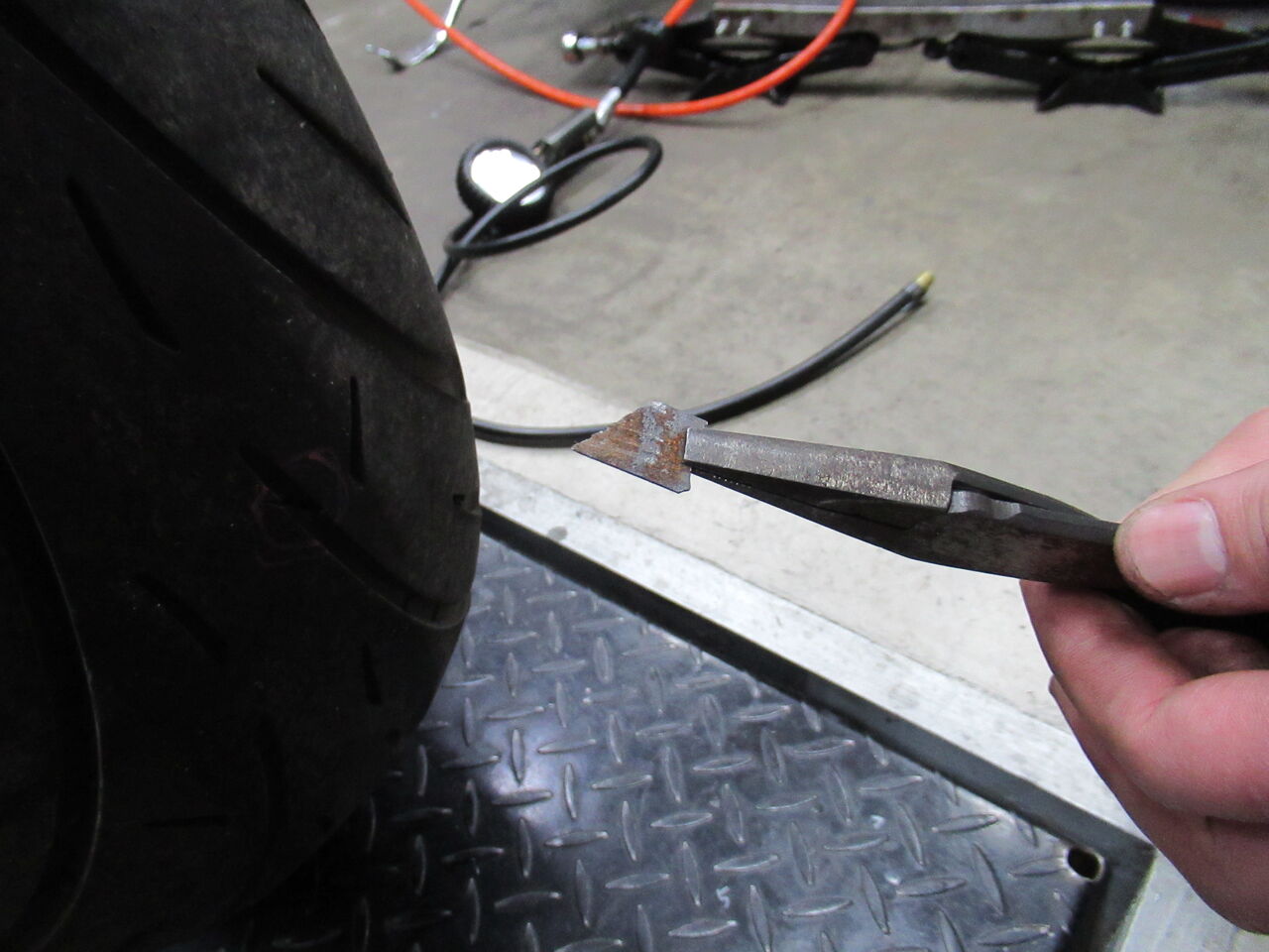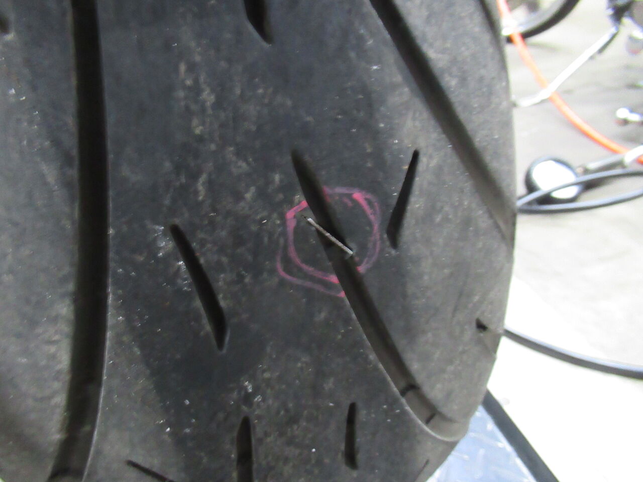 聞けばリアタイヤを交換したばかりらしく、どうにかパンク修理のみで対応してほしいとのこと😥