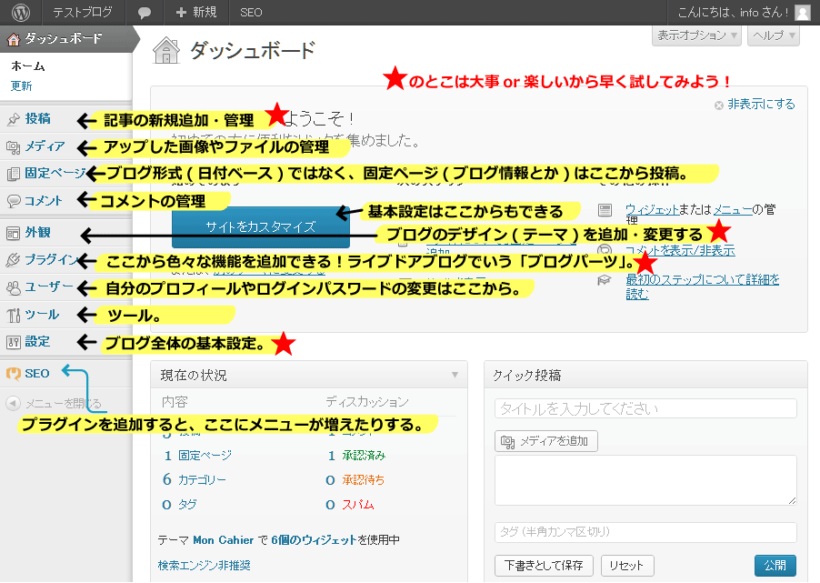 Wordpressは基本的に、直感で操作できるようになっています。とにかく自分で管理画面を操作して、色々と試してみましょう。あれこれと色々な機能があるので、まずは大事なとこや楽しい部分から試してみましょう。