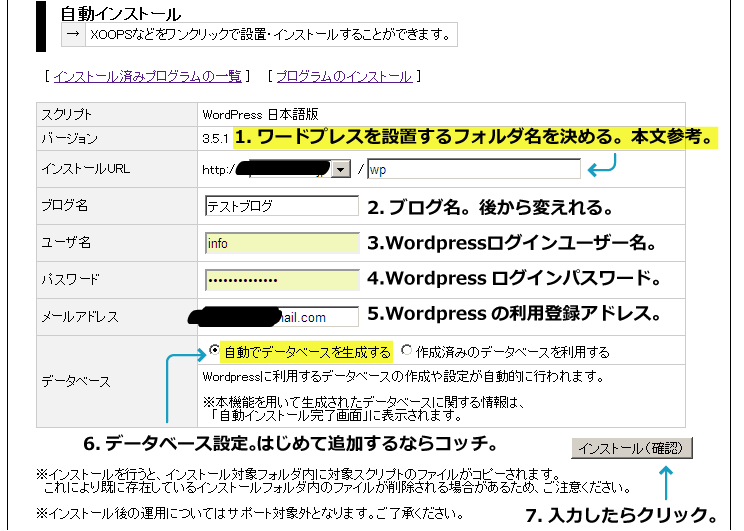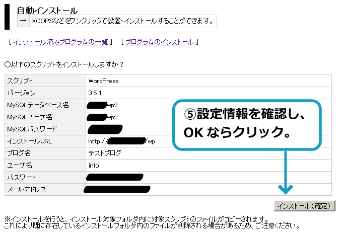 全て入力したら『インストール確認』をクリックします。もう少しで、インストール完了ですよ!