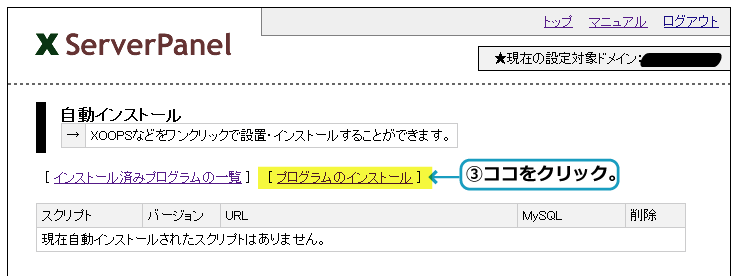■下記の画面が表示されるので、③「プログラムのインストール」をクリック。