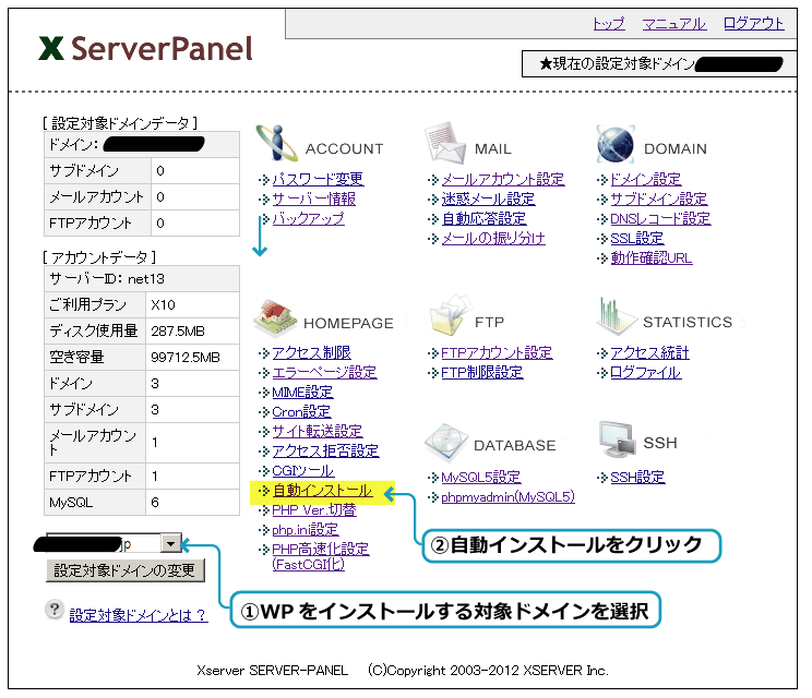 対象ドメインとは、Wordpressを運用するためのドメインです。通常は独自ドメインで運用+公開することになるので、先にドメイン設定を済ませておきましょう。今回は動作テストなので、独自ドメインではなくエックスサーバーの契約時に付加される『~.xsrv.jp』にWordpressをインストールしてみました。