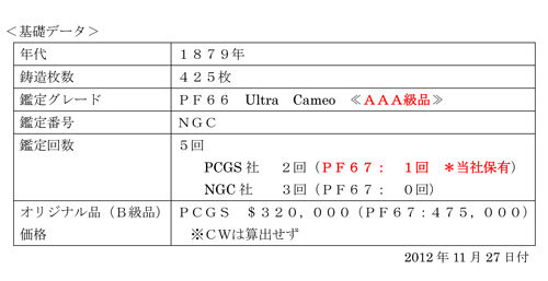 しかも、一ランク上の【PF67 Ultra Cameo】は一枚も存在しておらず、PCGS社鑑定の【PF67 Deep Cameo】が一枚のみ存在していますが、この一枚は当社永久コレクションに入っており、当社以外では見ることさえもかなわない存在になっており、購入することは不可能になっています。