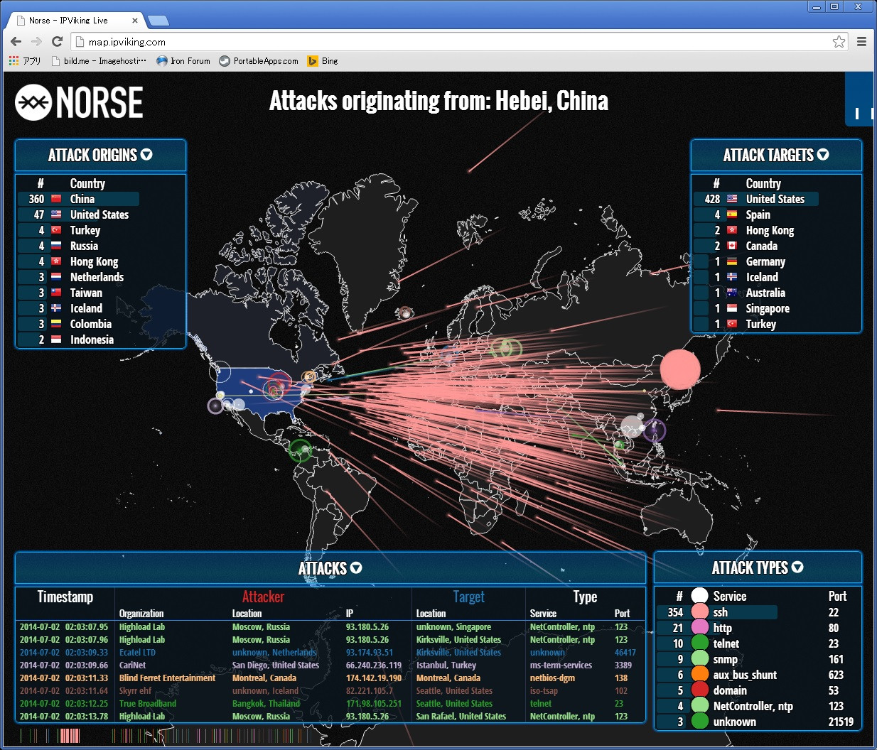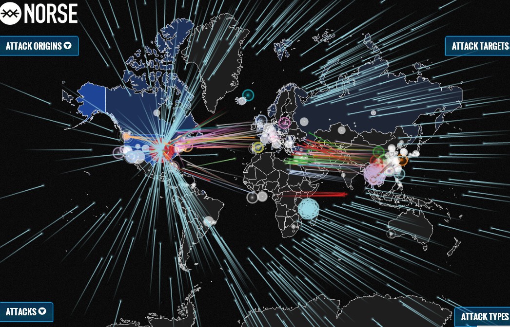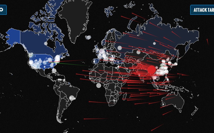 サーバー攻撃の状況が世界地図上でみえるサイト。