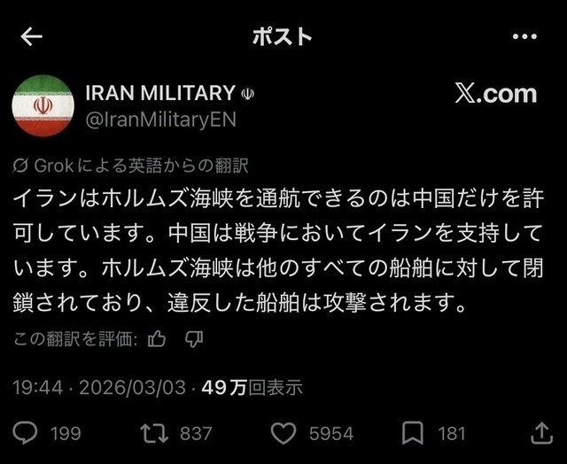 「ホルムズ海峡封鎖で中国死亡!」