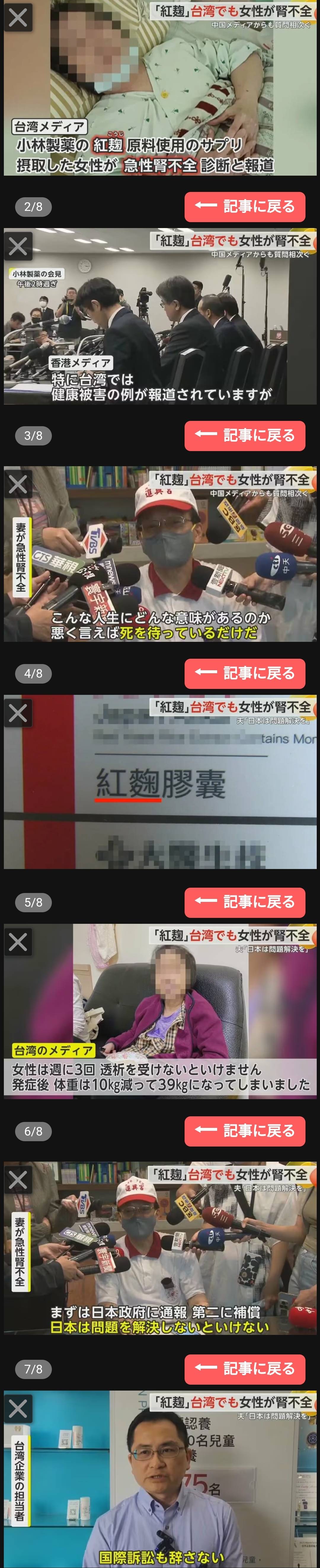台湾のメディアは、小林製薬の紅麹(べにこうじ)原料が使われたサプリメントを摂取していた女性が、急性腎不全の診断を受けていたと報じた。