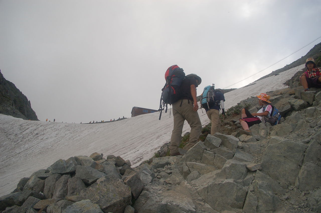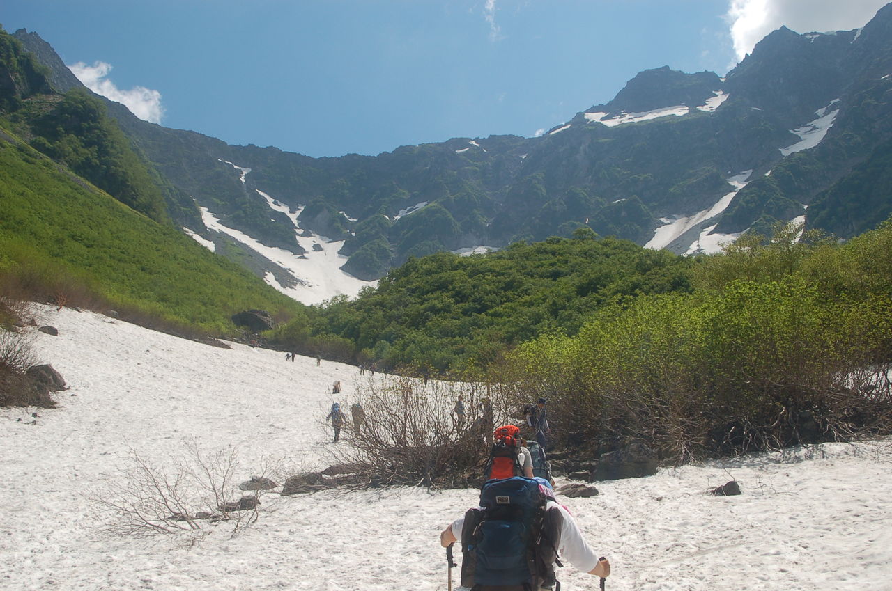涸沢手前の雪渓を登る。
