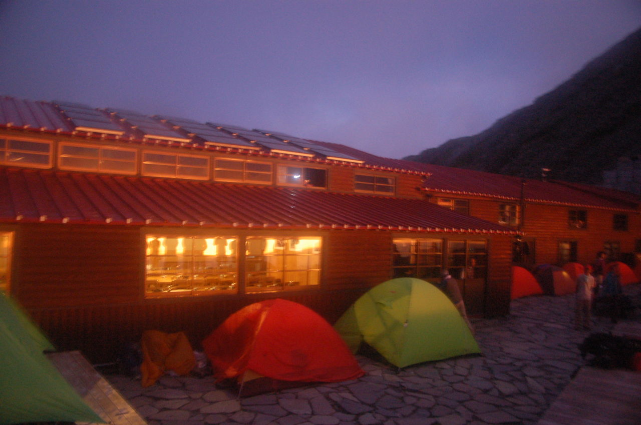 小屋は1畳に2名程度の混雑。これでも思ったほどは混んでいなかった。それでも、私他2名は混雑した小屋が嫌でテント泊。テント客は多く、指定された幕営場所は小屋の食堂の前。ビールとつまみ程度で簡単に夕食を済ませて早めに寝るが、周囲が明るく、うるさくなかなか眠れない。また、気温も低く寒かった。下界のうだるような暑さに比べて3000mのこちらは寒かった。