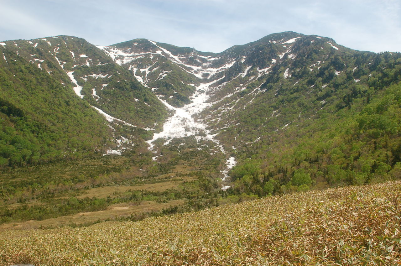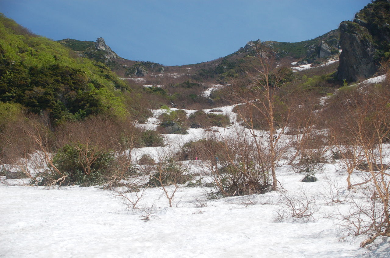 大日平から程なくして雪が現れる。それほどのことも無いだろうと思っていたが、雪は一向に消えずずっと上まで雪渓が続いている。昨年の同時期にも登っているがそのときはこんな下には無かった。去年の感覚で来ており、4本爪アイゼンしかもって来ておらずストックも無い。もちろんグローブも無いので雪に手を突くと冷たい。