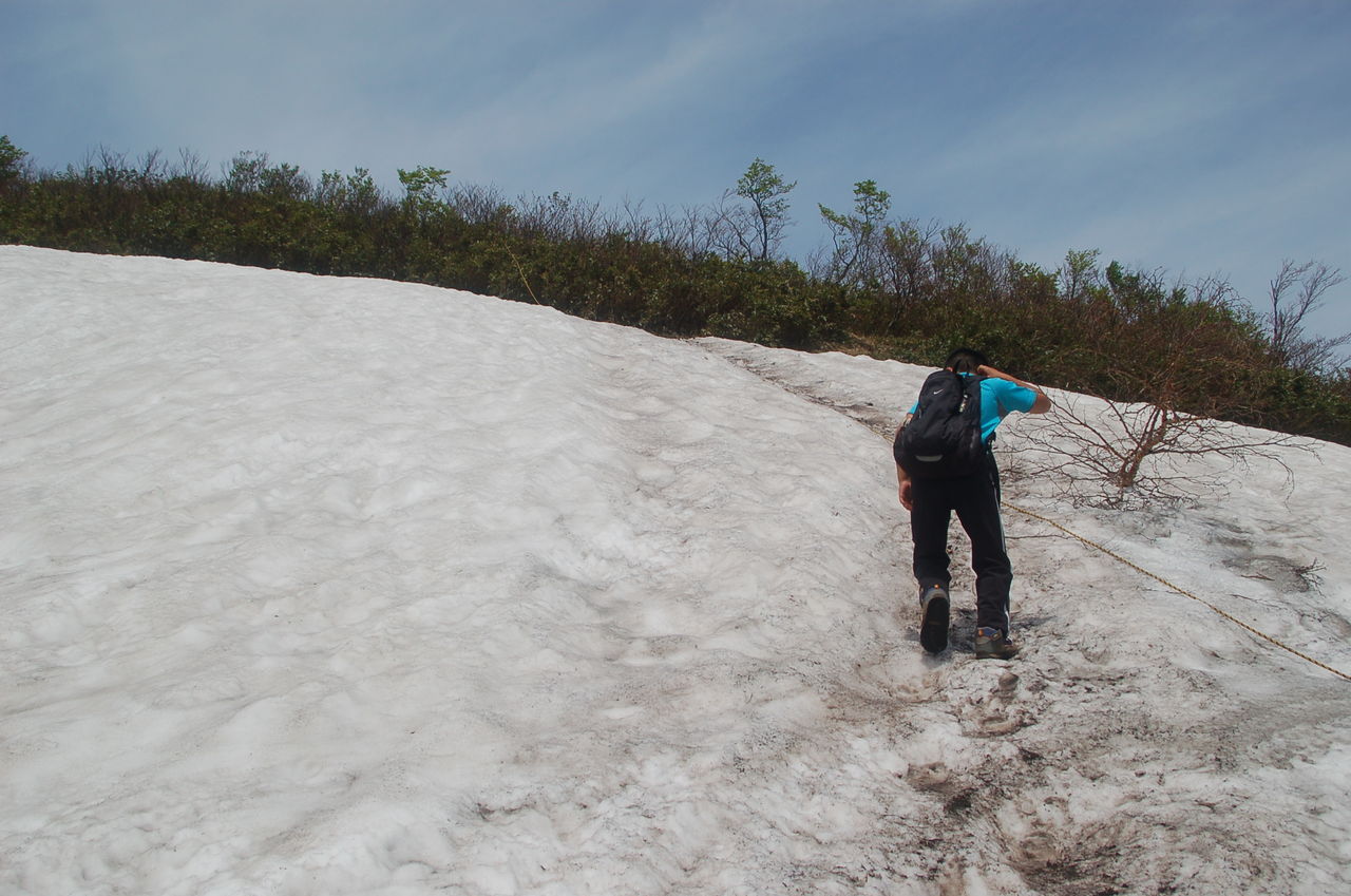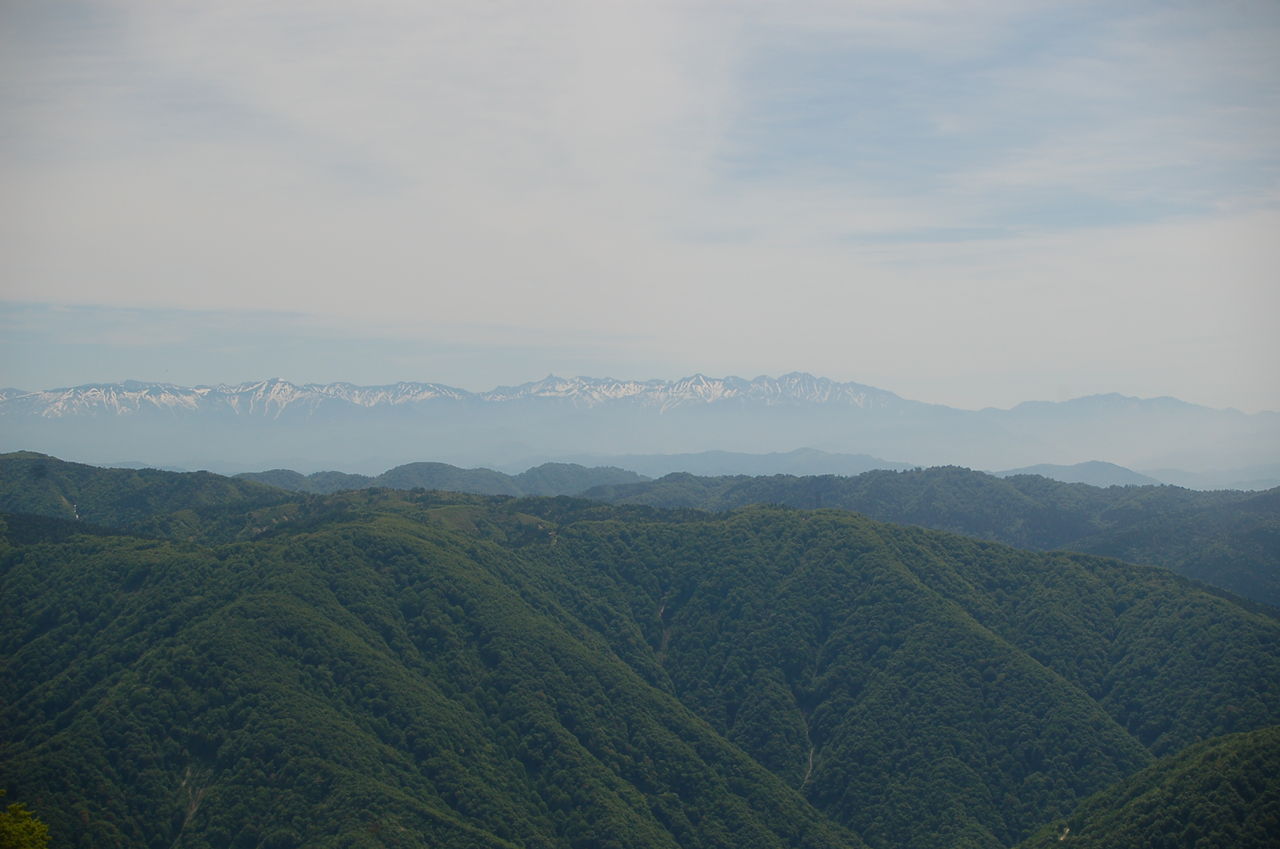 駐車場にはすでにたくさんの車。新100名山と言うことで県外ナンバーも。ゆっくりと登り始める。この山は出だしが緩やかなのでペースをつかみやすい。針葉樹林から広葉樹林へ植生も変化していく。てつろうは社会の時間に地図記号を勉強していて、針葉樹林と広葉樹林を習ったのでちょうど良い実地勉強だ。だんだんきつくなって来たところで宮屋敷跡に到着。北アルプスがきれいに見える。朝日岳から御岳まで、こんなに見えたのは初めてだ。ここから頂上までは尾根歩きになるが、北アルプスを眺めながら歩くことになる。ちょっと遠いけれども絶好の展望台だ。一部に雪は残り、急登もあるが快適な尾根歩き。三ヶ辻山との分岐を過ぎたところからは白山が見え出す。頂上には10人ほど。軽く食事をして出発。時間もあるので三ヶ辻山にも足を伸ばす。