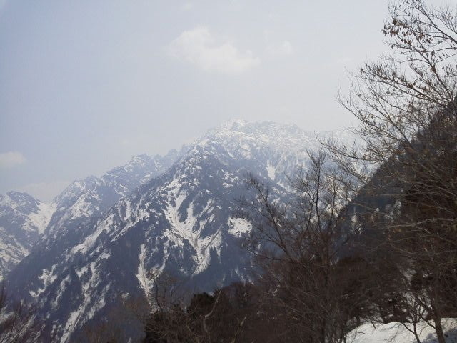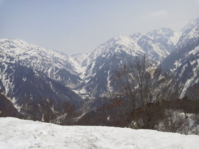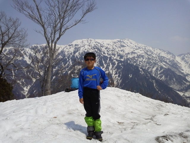 頂上には先客2組。後に1組。意外と人は少ない。景色はもちろん良いが、剣はややかすみ春の空気。下山は反対側に行くことに。山頂にいた人みんなで行ってみることになった。鞍部まではちょうど良い感じの下り。木の少ないところではお尻で滑る。鞍部からの下りも初めは良い感じ。てつろうは途中スリップして、軽快にお尻で滑り降りる。特段危険は感じない。登りのルートだと、滑るにはやや急で怖いかも。下のほうでは雪が切れてくるし、川を渡るところも出てくるのでそれなりに難儀する。水量は多いものの渡渉は難しくない。下りた後は馬場島方面へゆっくりと歩く。アスファルトが足に堪えた。