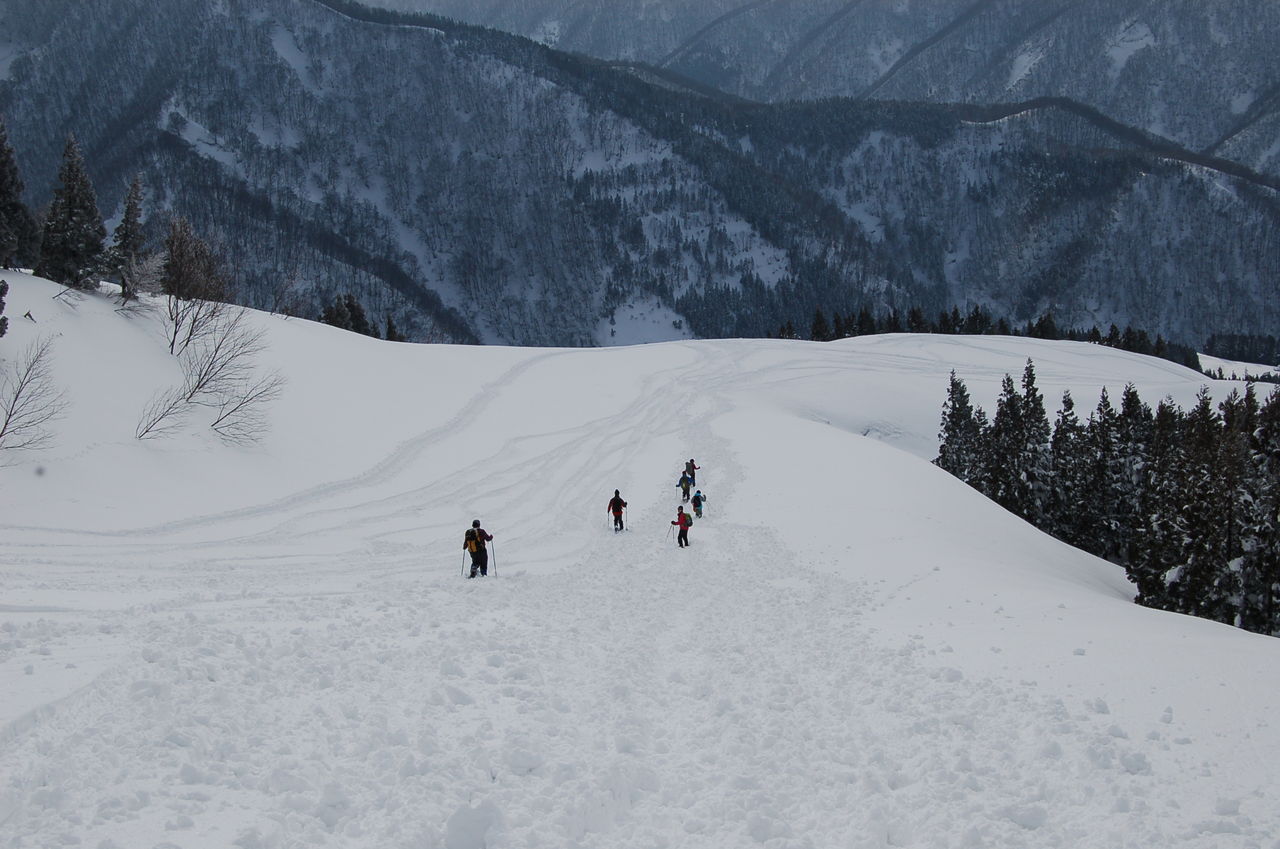 帰りはスノーバレー利賀への稜線をたどりスキー場へ。全面雪に覆われ春よりも歩きやすい。何度かアップダウンを繰り返しスノーバレー利賀上部へ。そこからはゲレンデを下る。スキー場は営業していないがなぜか途中から圧雪してある斜面が現れる。そこからはお尻で滑り降り時間短縮。
