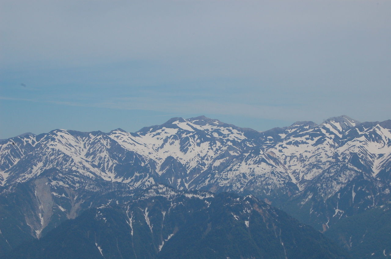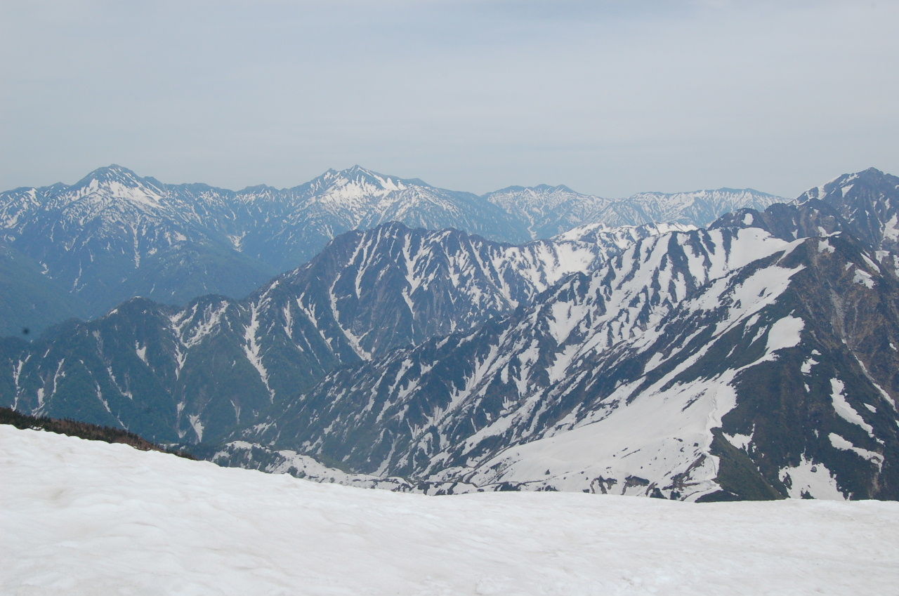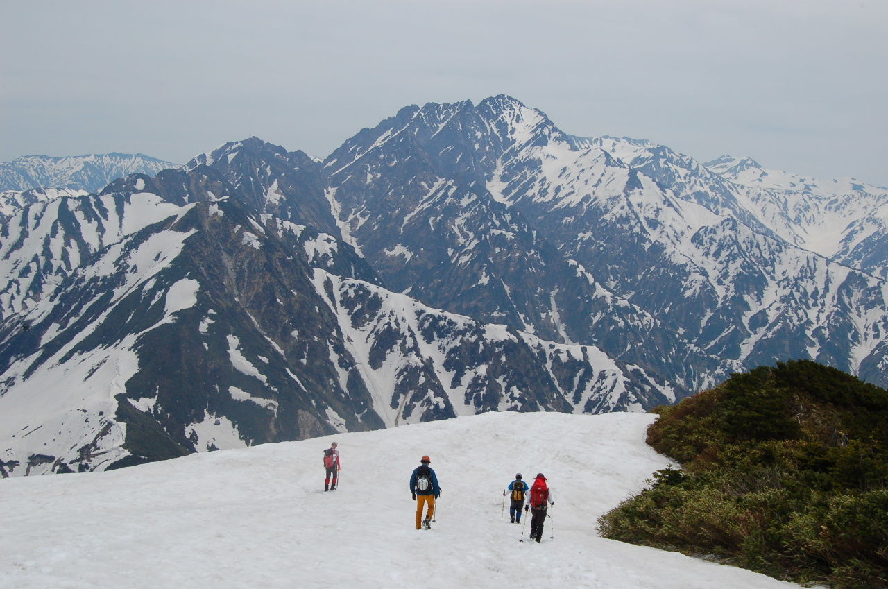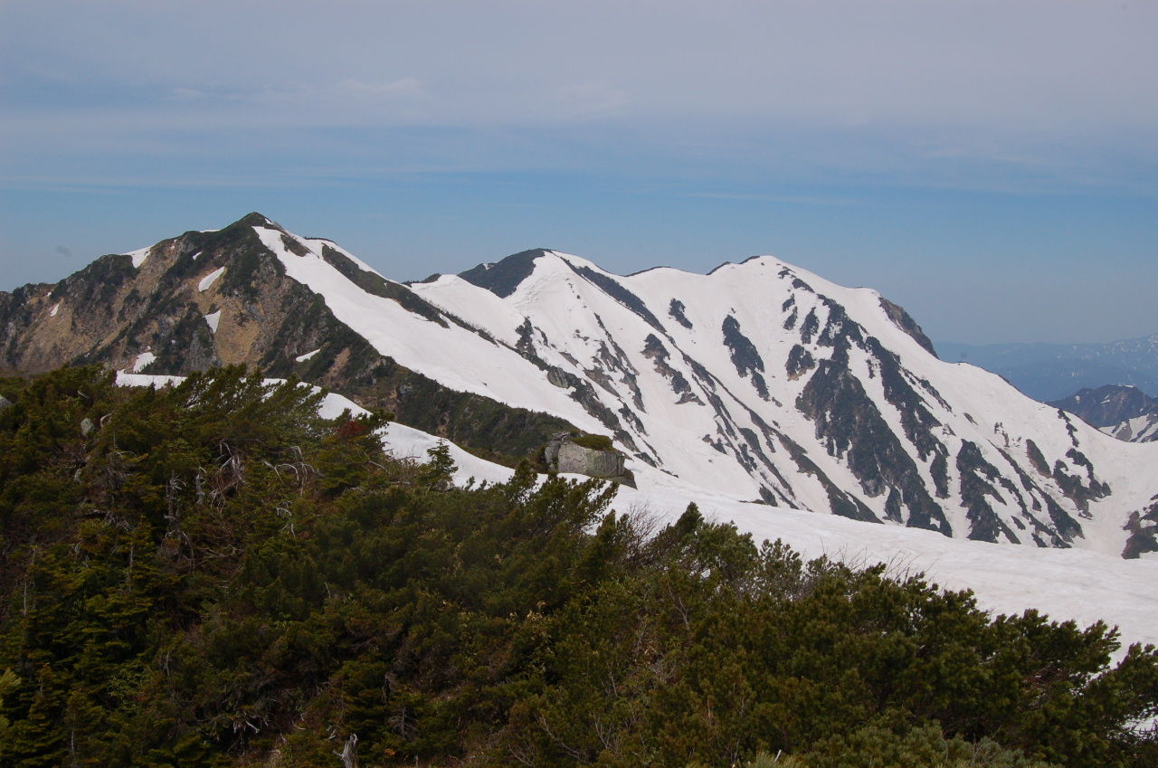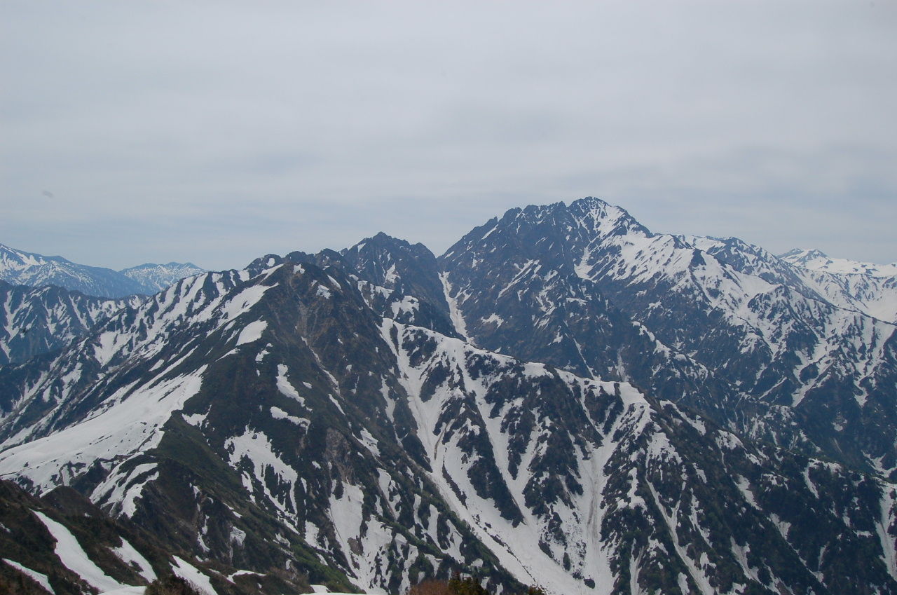 ここからは一部夏道も使って頂上を目指す。所々急な雪壁があったり、夏道を見失ったりと意外と苦労して頂上へ。ここから見る剣はまた見え方が違うし、後立山は白馬も見える。もちろん、釜谷、毛勝の三山も。