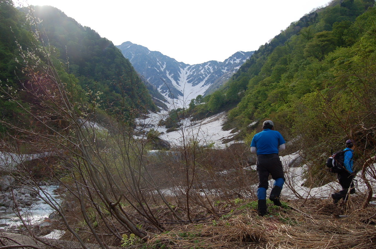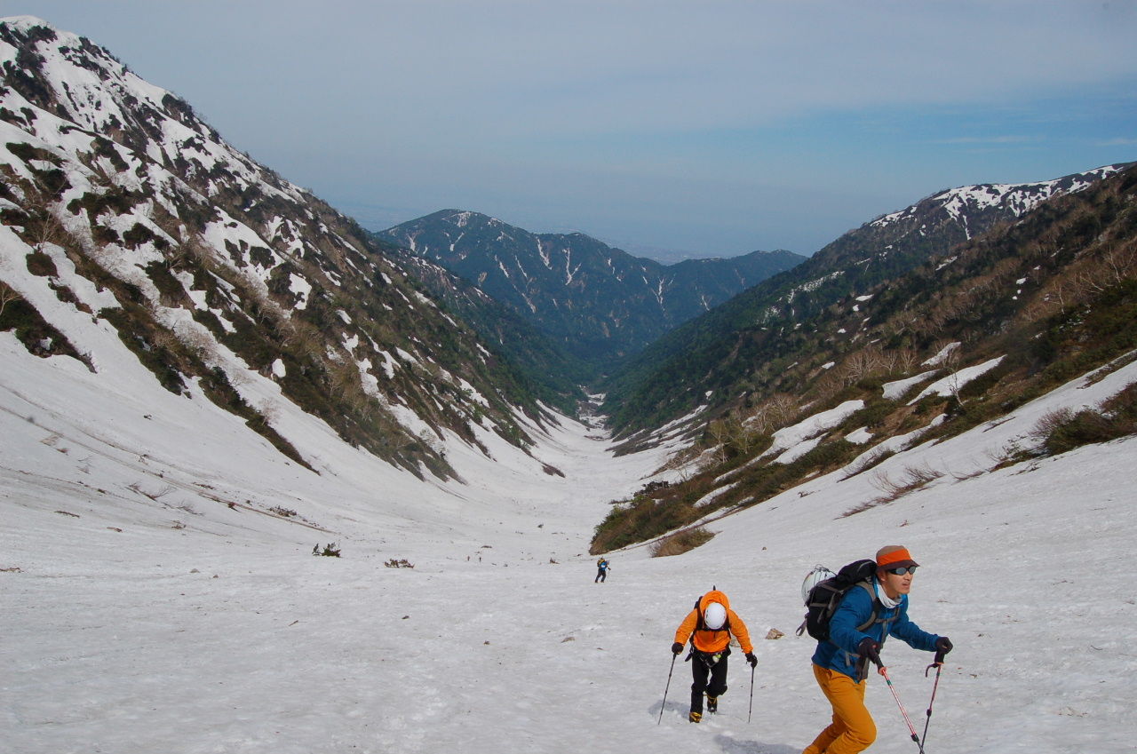 始めは林道歩き。所々、雪崩れたところや土砂崩れが道を塞ぐが通行に支障は無い。最終堰堤まで林道を歩く。最終堰堤を過ぎるとそこからはずっと雪の上。始めはなだらかだが、進むに従い急になる。二股(釜谷との合流)を過ぎた辺りから傾斜が強くなり始め、三又より上は結構な急斜面。怖いと言うほどではないが、滑落したら数十mは落ちそう。先行者のステップを使わせてもらい徐々に高度をあげていく。足元を見て必死で登っているので時間は気にならなかったが雪渓の上に出てから3時間ほど歩いて大猫からの稜線に。剣岳はもちろん鹿島槍、五龍といった後立山の山々も見渡せる。