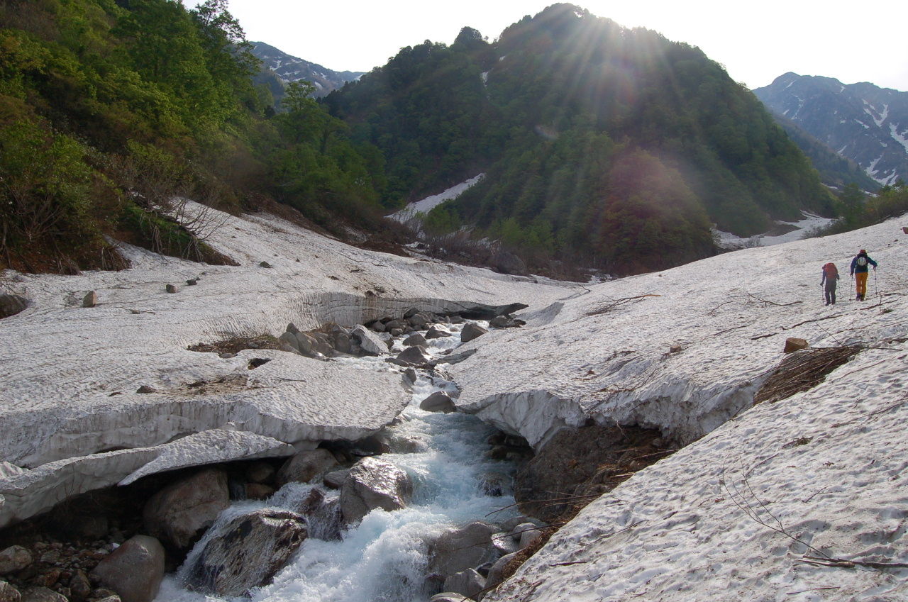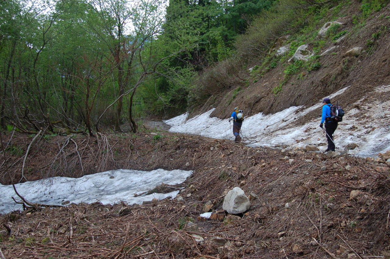 猫又谷の下りは始めは急な下りだが、怖いほどではない。雪も午後には緩んできており慌てなければ大丈夫。二股までもったいないくらいの速さで下ることができる。そこからは斜度もゆるいことからなかなか進まない。
