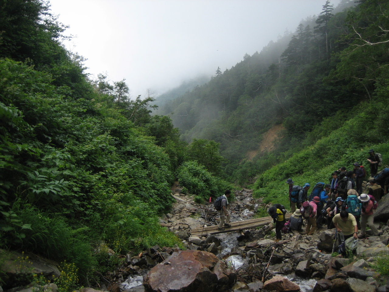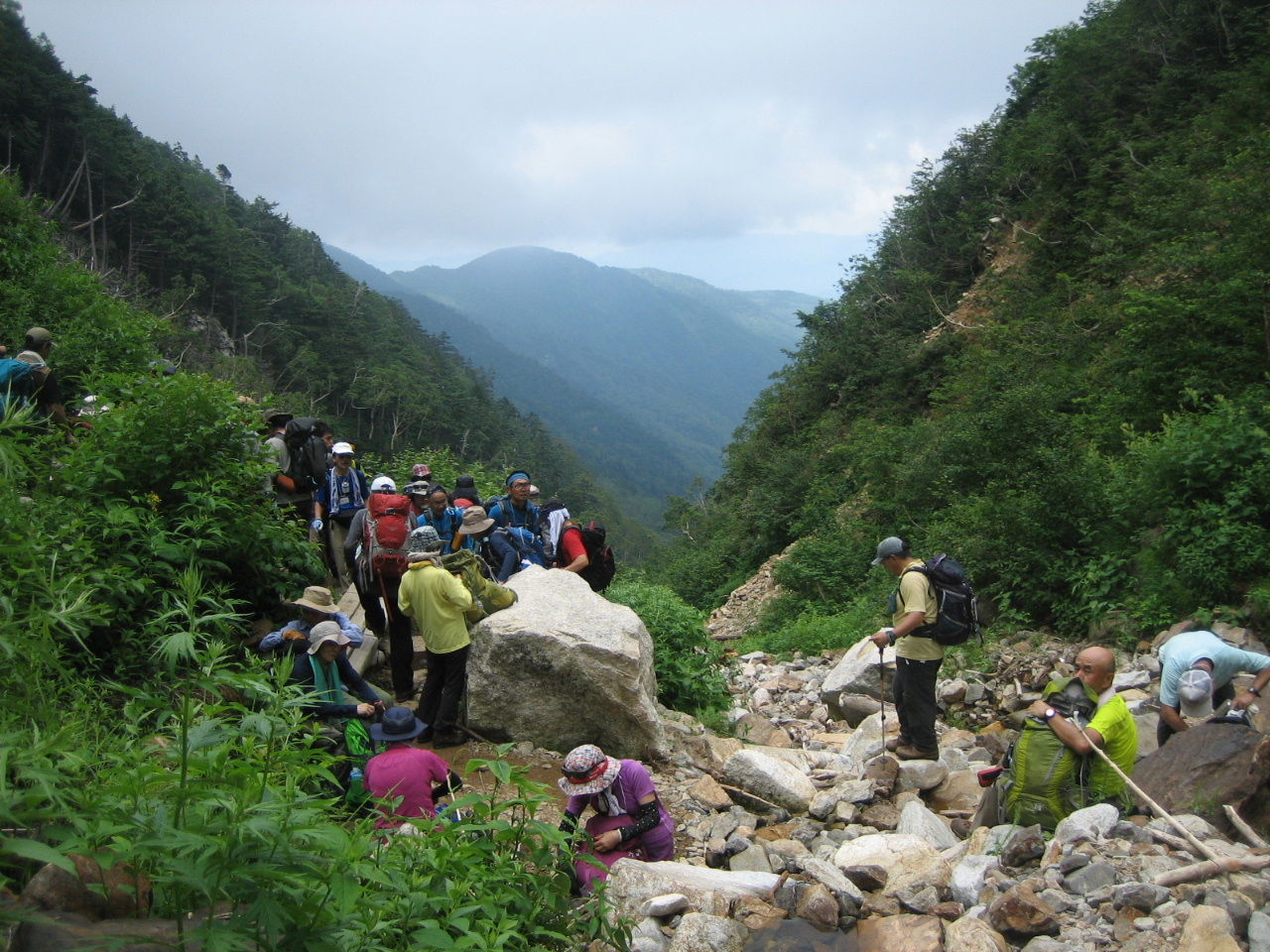 一ノ沢のルートは人気があるようで結構な人。我々のような団体もおり、すれ違いや休憩場所など行動に気を使う。道は整備されており浮石も少なく歩きやすい。はじめのうちは平坦な道なので息が切れることもなく歩ける。ゆっくりとしたペースで50分を目安に歩くが、参加者は問題なくついてきている。