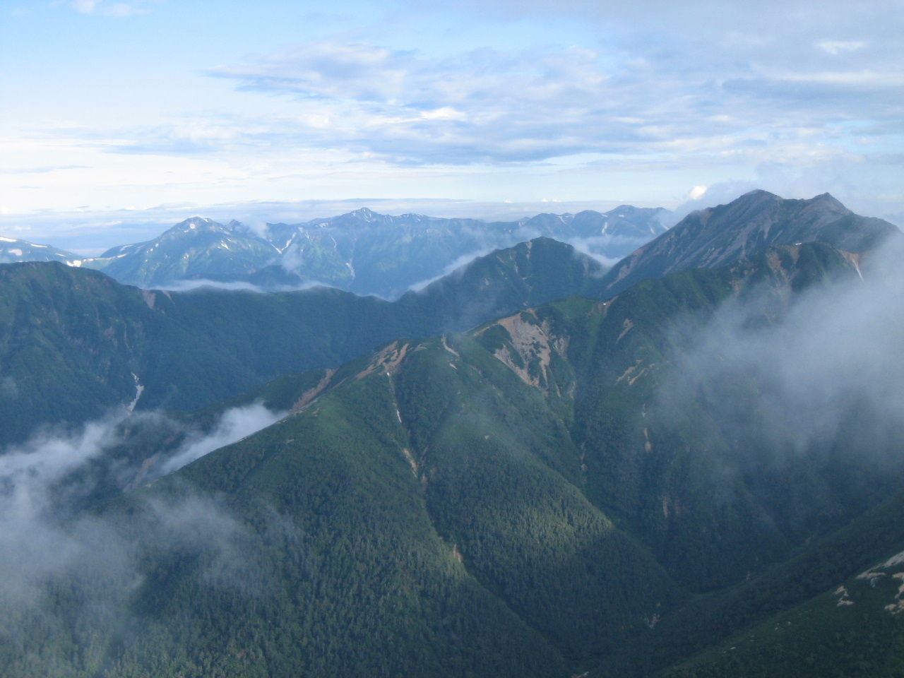 翌朝は3:30起床。4:20から食事。荷物をまとめた後頂上へ向け出発。夜はガスが出ていたが、今朝は比較的景色は良い。槍穂高はしっかりと見える。日の出も見ることができた。