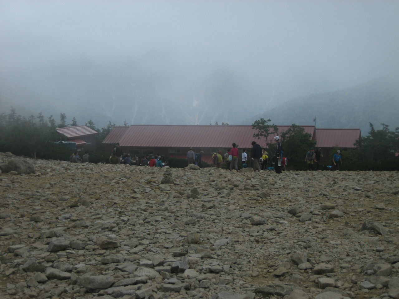 雨に降られることもなく小屋に到着。予想通りの混雑だが布団2枚に3人というスペースは与えられた。食事は18:40から。4回転目くらいになるのかなあ。