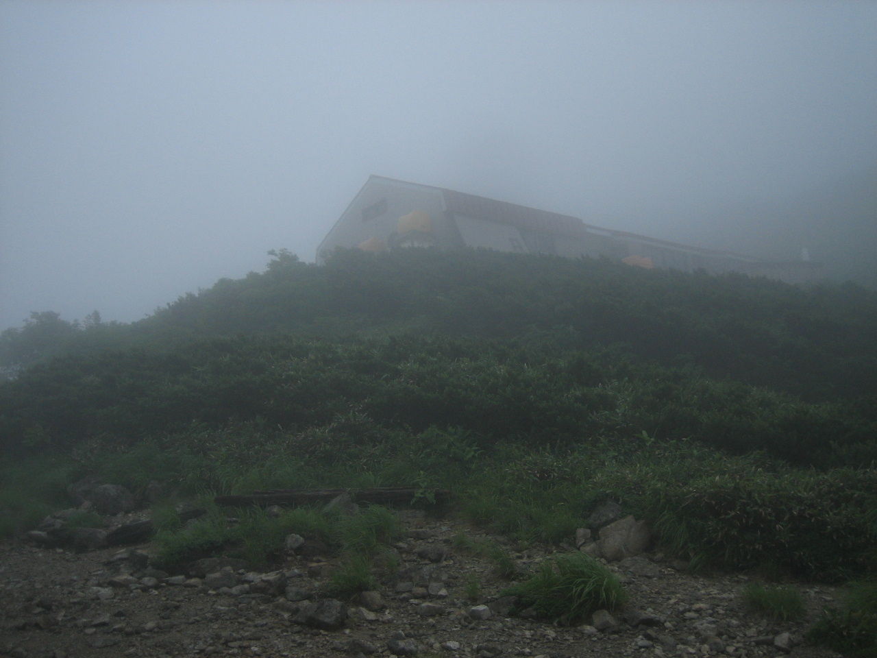 大日小屋前。すぐそこの小屋もガスで見えづらい。