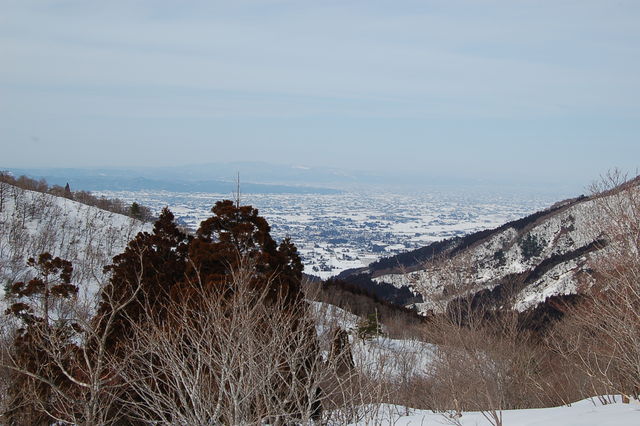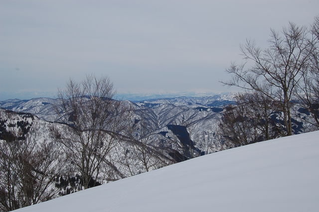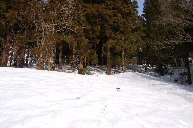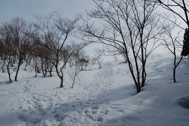 雪は下から十分にある。人気の山なので踏み跡も多く、かんじきなしでも沈むことはほとんどない。足元が軽い分順調に登ることができる。唐木峠を過ぎ尾根に入ったところで地味に疲れてくるが。縄ヶ池からの稜線が見えているところで15:00。なんとか行けそうだ。15:15に頂上。残念ながら景色が白んで眺望は今一つ。