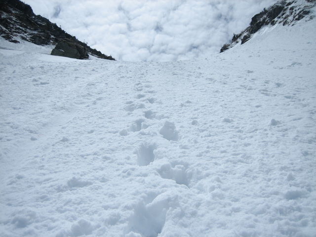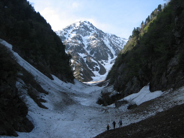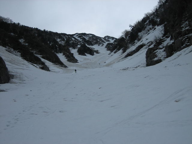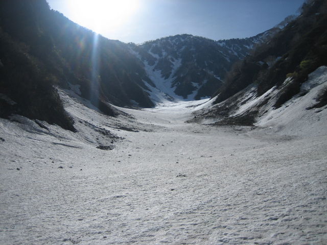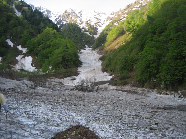 谷にはデブリが多い。また、水曜日あたりに降ったと思われる雪が表面を覆う。デブリが多いということは、最近それだけ崩れたわけで、なんだか嫌な予感。予感は的中し、2回雪崩に遭遇。1回目はあと数メートル先に進んでいたら巻き込まれるところだった。2回目は正面から雪崩が襲ってくる。だが、両サイドに雪崩の通過跡があるのでそちらに流れるはず。じっと我慢して雪崩をやり過ごす。読み通り雪崩は両サイドを流れていった。雪崩は静かに流れてくるのでわかりにくいし、その規模もはじめの状態からは分からないので厄介。今回のものは新雪の表層雪崩のようで、量は少なく岩なども含んでいないために巻きこまれても大事には至らないだろうと思われるものだった。新雪とは言え水分を含んでいるので速度も遅いし。
