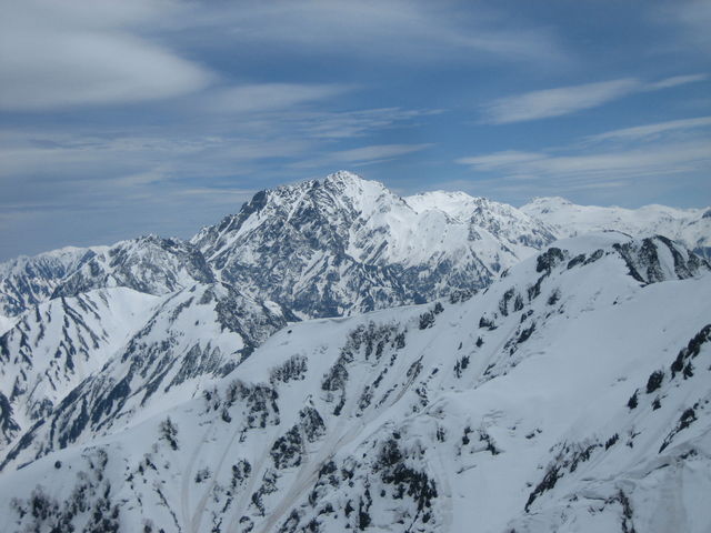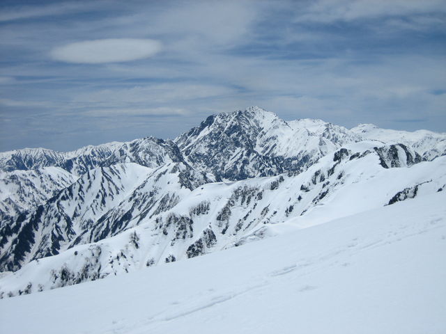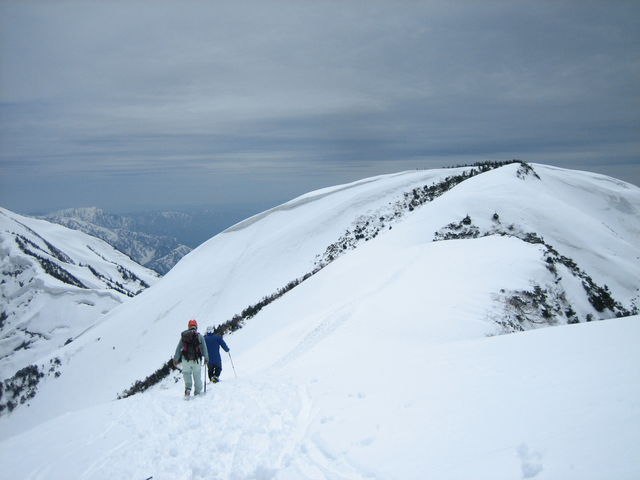 そうこうしているうちに最後の直登。2年前よりも斜度は緩やか。上部ではさらに緩やかになる。稜線に出ると剱岳や後立山が目に入り圧巻。前回は真っ白で何も見えなかった。風は強く体感温度は低い。頂上に向け稜線を登っていくが新雪で足を取られるし沈み込む。ここではかんじきが欲しい。20分ほどで頂上へ。風はコルほどはひどくない。景色を堪能したり、遅れたメンバーを待ったりと強風で寒い中結構な時間頂上にいた。
