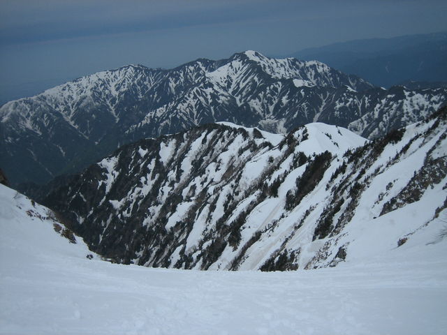 下りは、前回と違い下が見えるのでなんだか嫌らしい。新雪で沈み込むためスリップしてもすぐに止まるだろうが。ただ新雪に足を取られたり、雪が崩れたりして何度か転びそうになる。下っても下っても傾斜は緩やかにならないような感じで嫌になってくる。またデブリがひどくてスピードも上がらないし、大きく振り上げた足が攣ったりするなど難儀しながら下る。