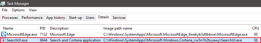 2019年8月31日に配信されたWindows10 v1903用KB4512941を適用後、一部環境でCPU使用率が高くなったまま戻らなくなる不具合が発生しています。アイドル中だろうとなんだろうと、以下の画像のようにCortanaのプロセス(SearchUI.exe)がCPUを食い続けます。
