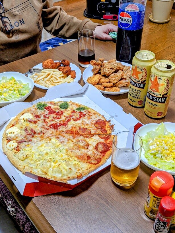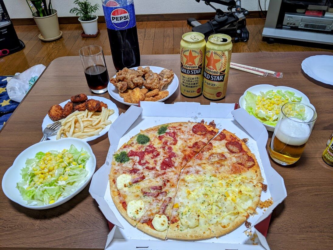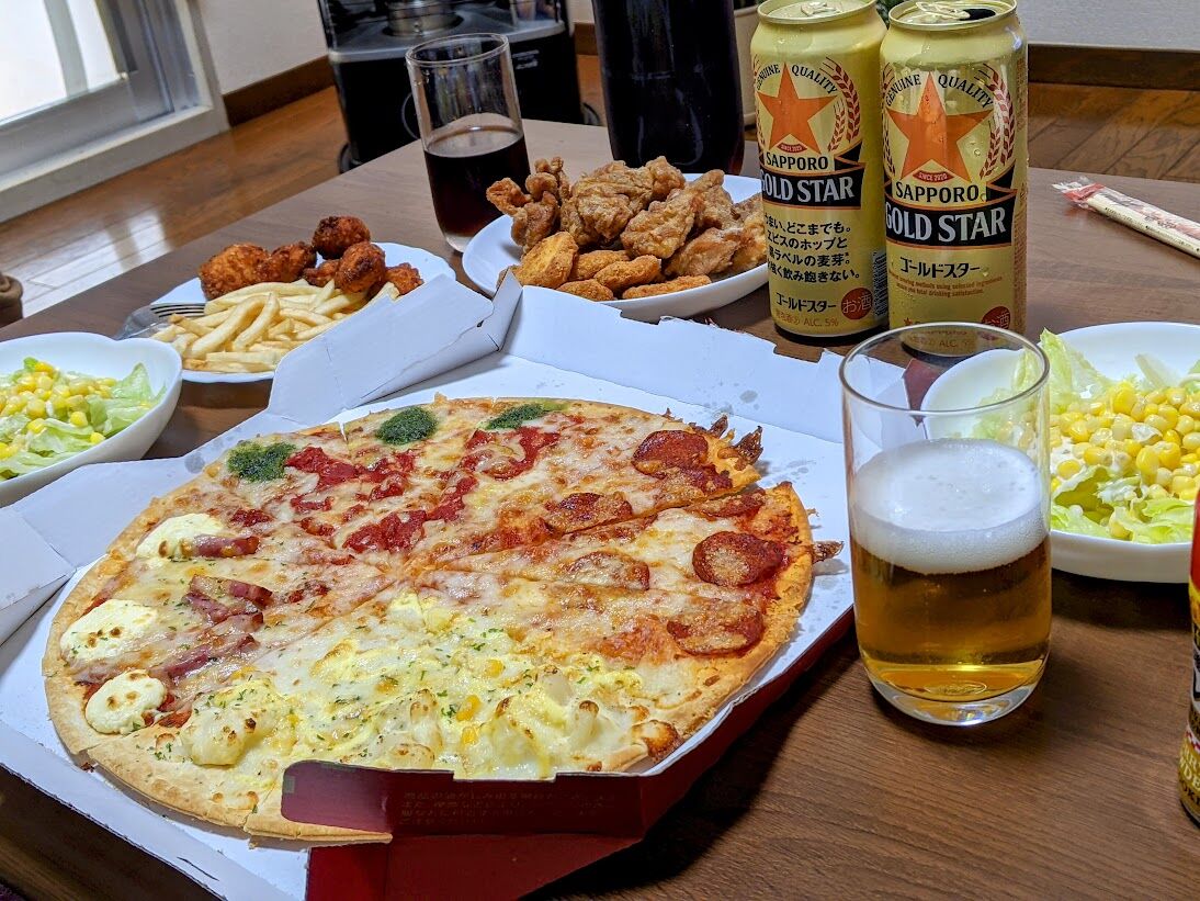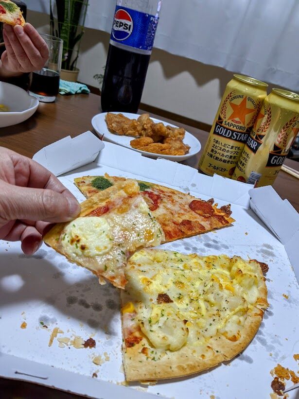 2025年04月10日 自宅で合同誕生日会を夫婦で 自宅で夫婦の合同誕生日会を少し贅沢な食事を黙々と食べながら本当に楽しく過ごせたのかい?の様子。お酒は500mlの缶ビール2本と凝った料理はせずピザハットのLサイズをメインにしましたが、数年前ならピザLサイズ2枚でも不足でした。誕生日を迎えた4/8誕生日の僕と4/10誕生日の妻が主役で日々の感謝を伝えあいました。 我等夫婦の個人情報が流出してしまうのも覚悟の上。1.5lペットボトルコーラはお酒の酔い覚まし用で、ピザの他にチキン、ナゲット、ポテト、野菜サラダを2人無言でがっつきました(笑)。 応援をよろしくおねがいしますにほんブログ村高次脳機能障害ランキング タグ :#誕生日#合同誕生日会#缶ビール#ピザハット#感謝