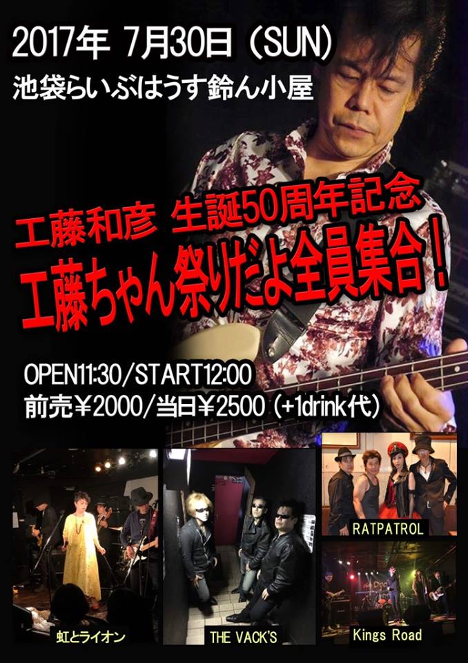 レコ初LIVEの興奮も醒めやらないまま次回のイベントのお知らせです。7月30日(日)のお昼に、ベースの工藤ちゃん(工藤和彦)の50歳の誕生日を祝って、彼の参加する4バンド(虹とライオン、THE VACK'S、RATPATROL、Kings Road)が一同に会するイベントを開催します。題して『工藤和彦 生誕50周年記念《工藤ちゃん祭だよ全員集合!》』!。