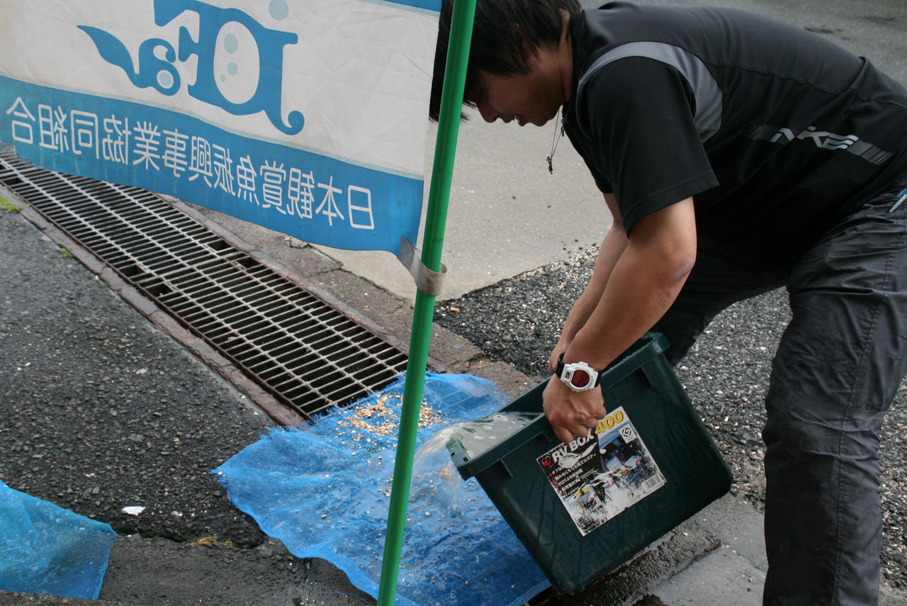 洗った濾材は 素早く 濾過槽に もどしていく。↓