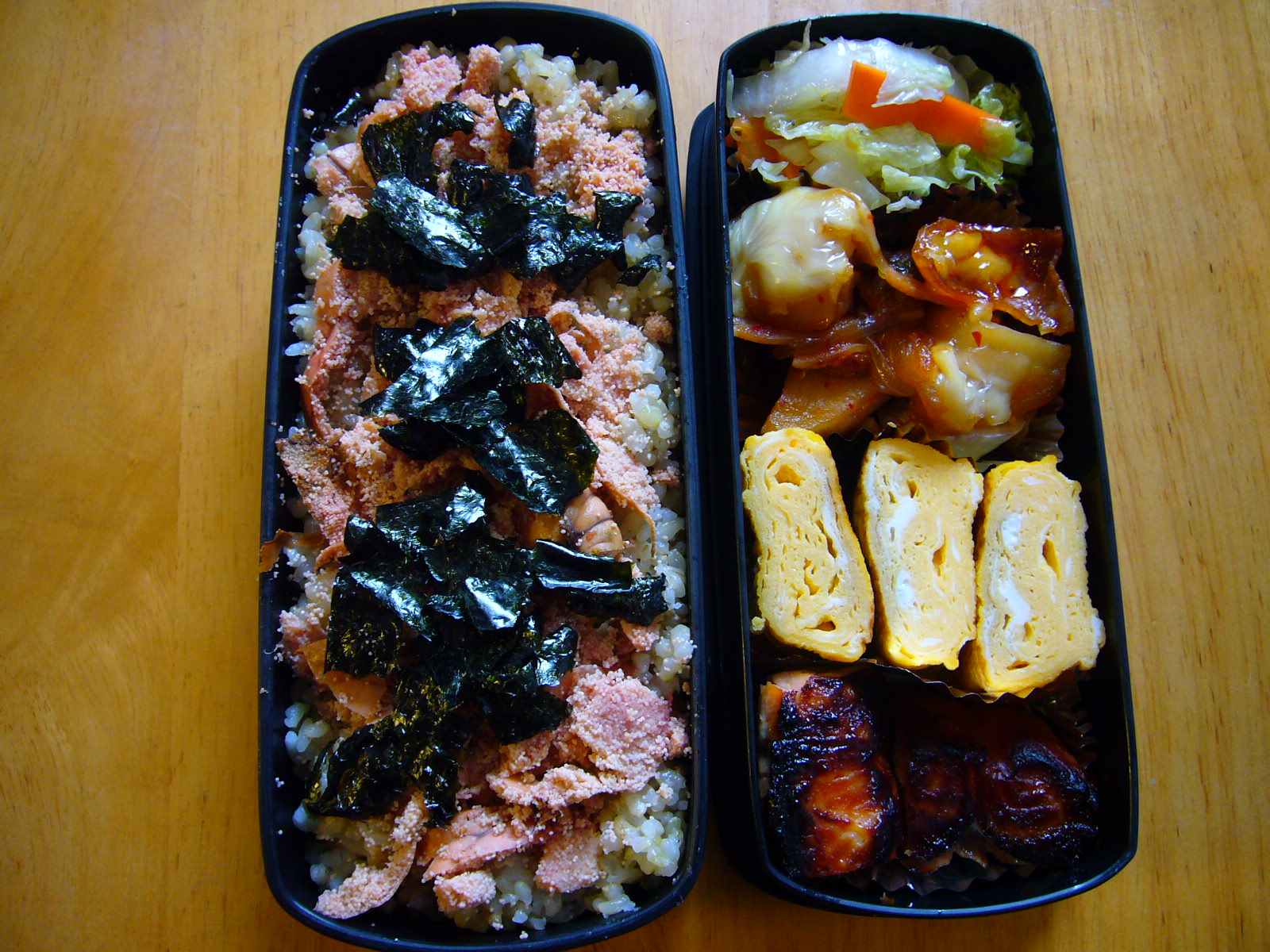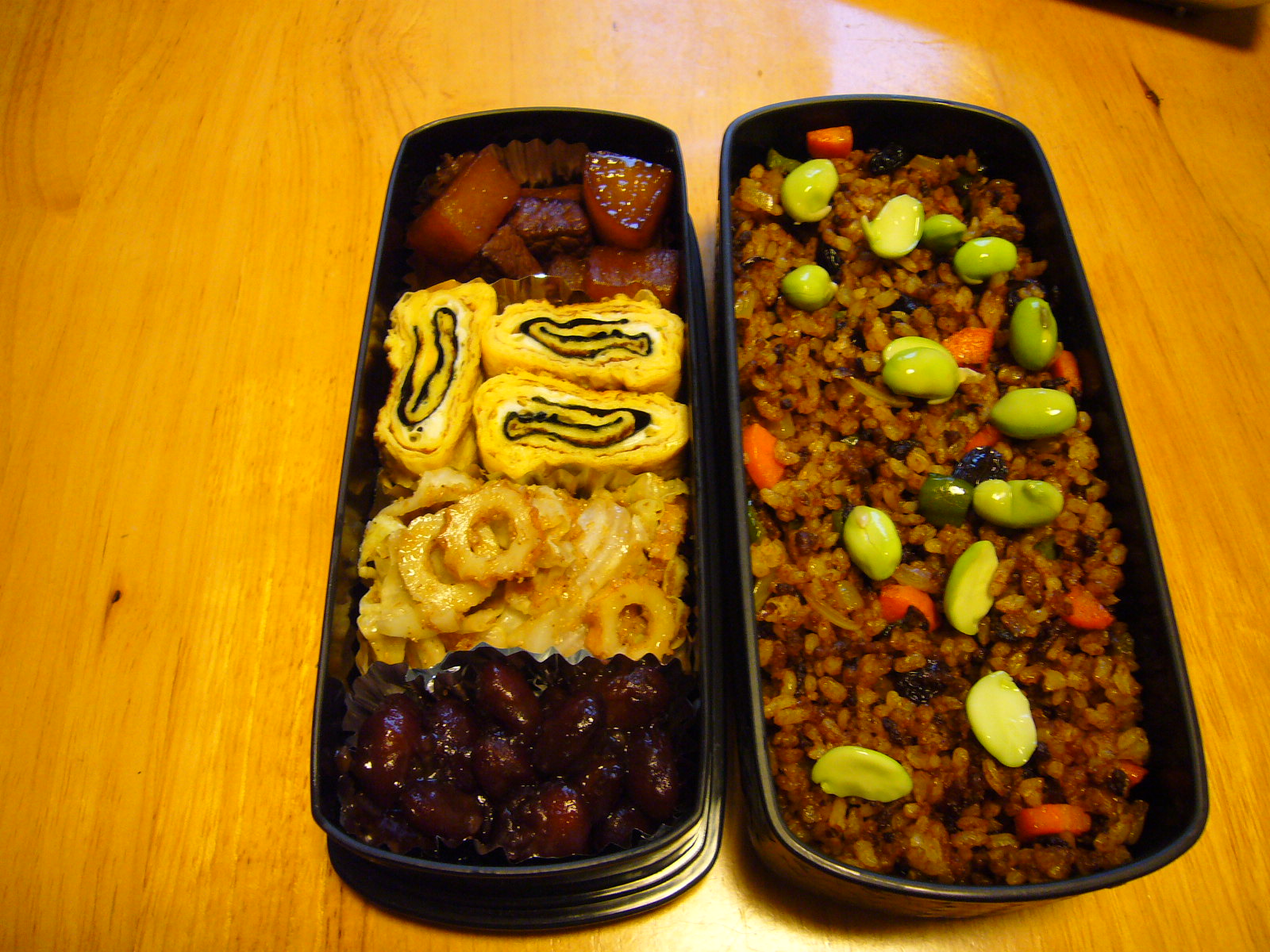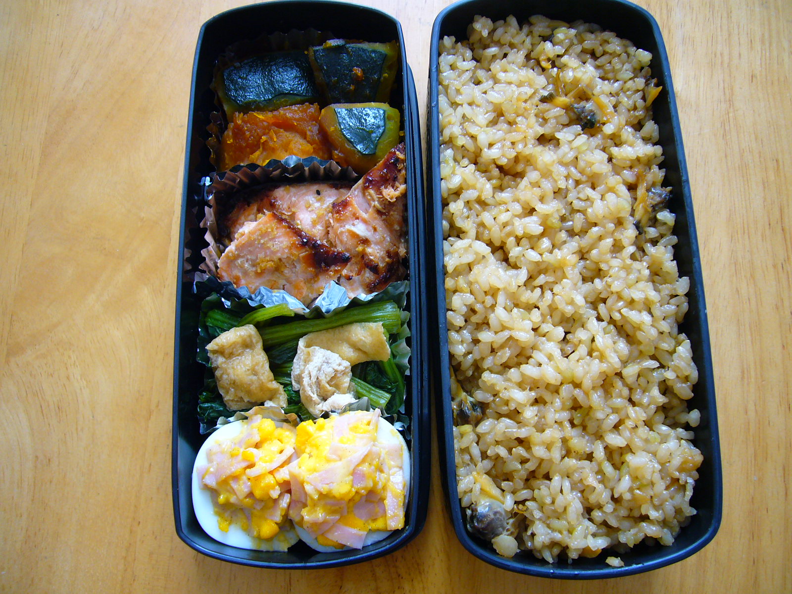 本当は秋刀魚の蒲焼を入れようと思って昨日買ってきたお刺身用の秋刀魚(一匹50円ですが(^_^;))を三枚にさばいてタレにつけ込み、小麦粉をはたいて、フライパンで焼くというようにいつも通り作りました。