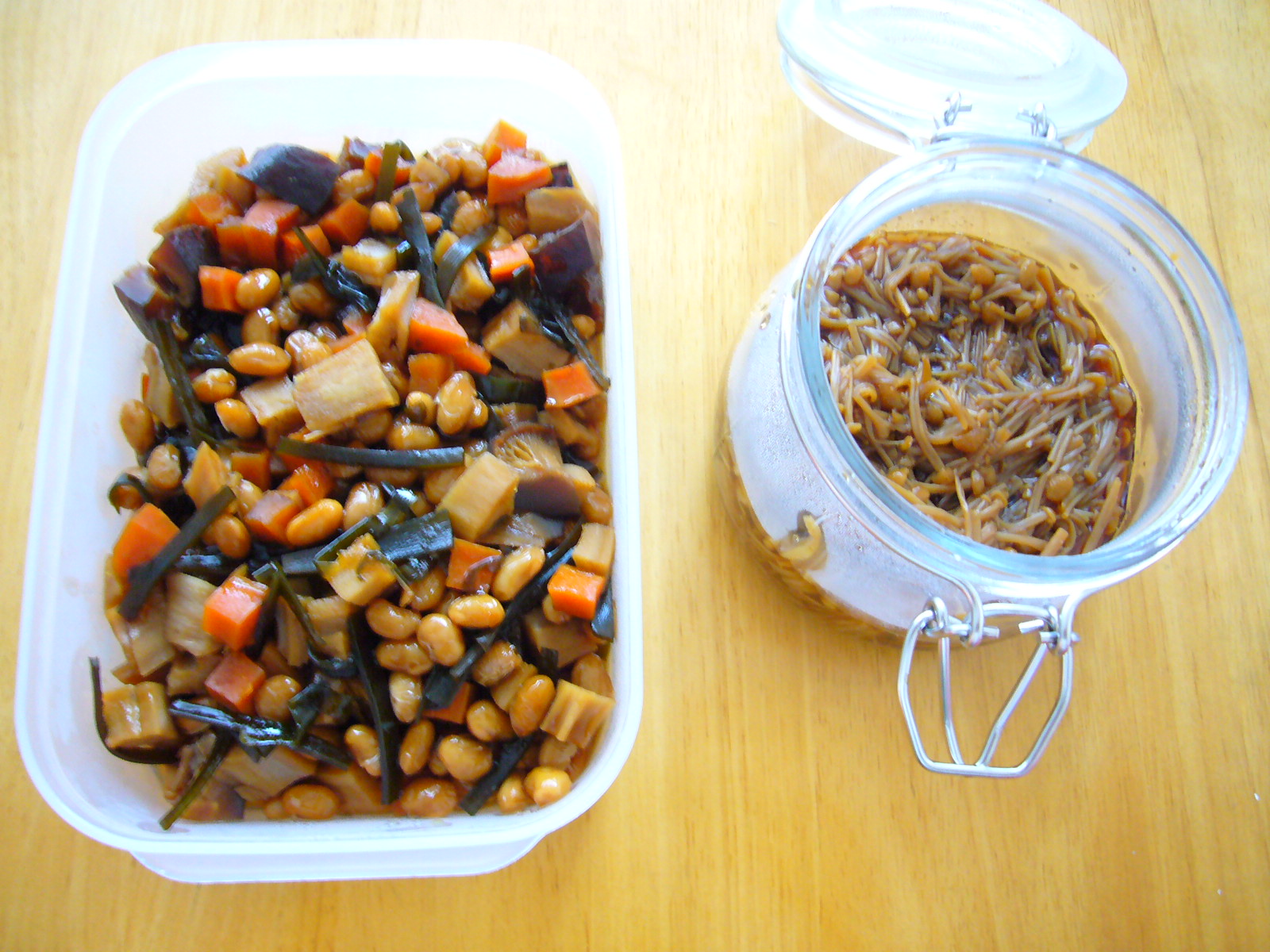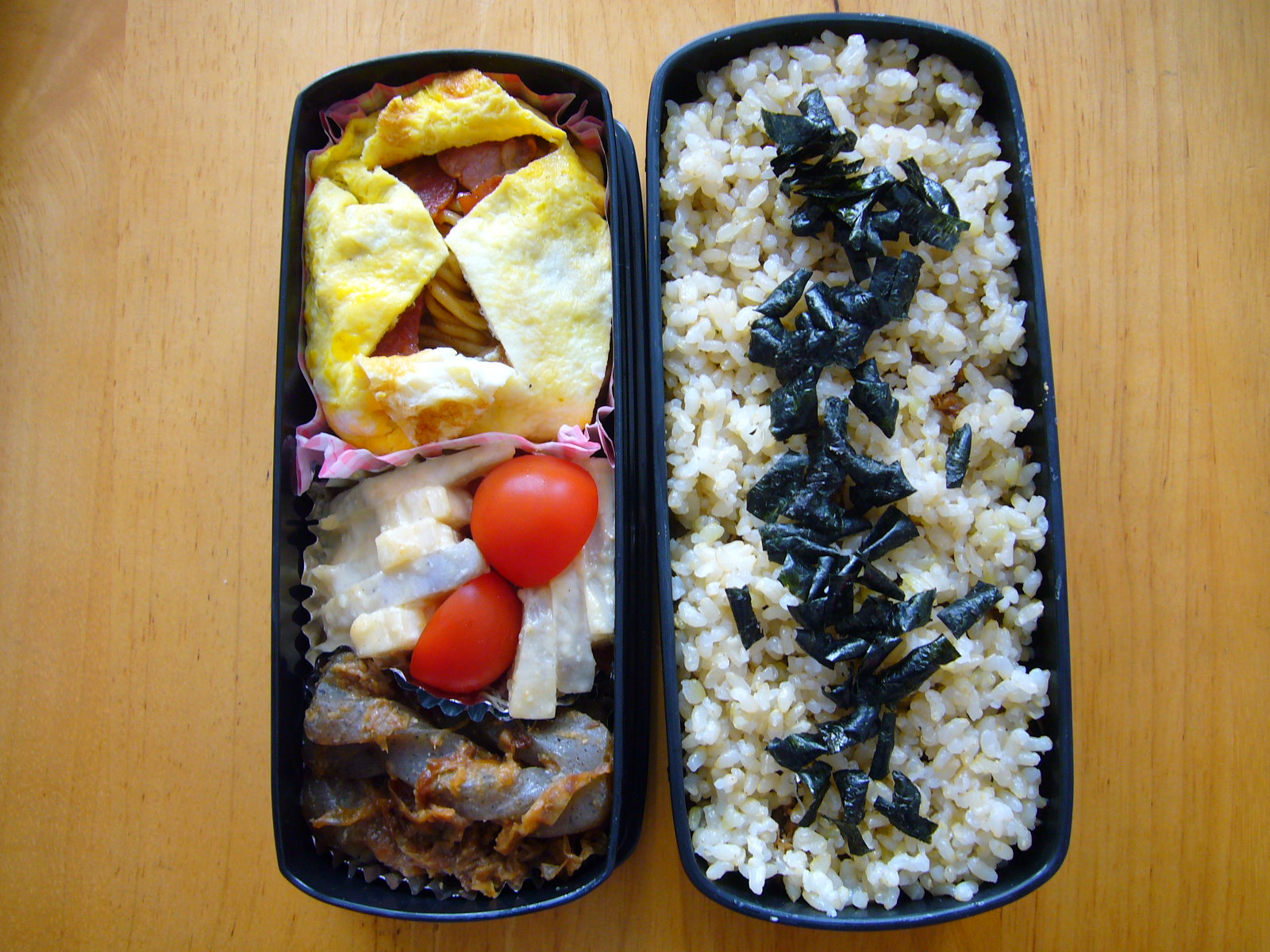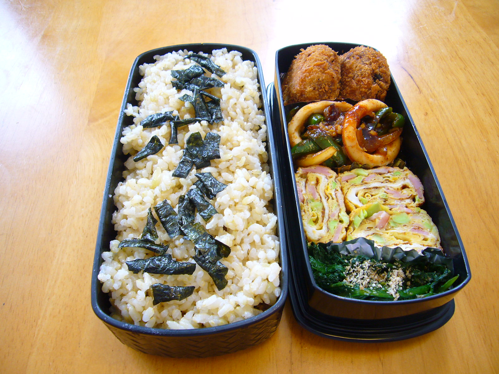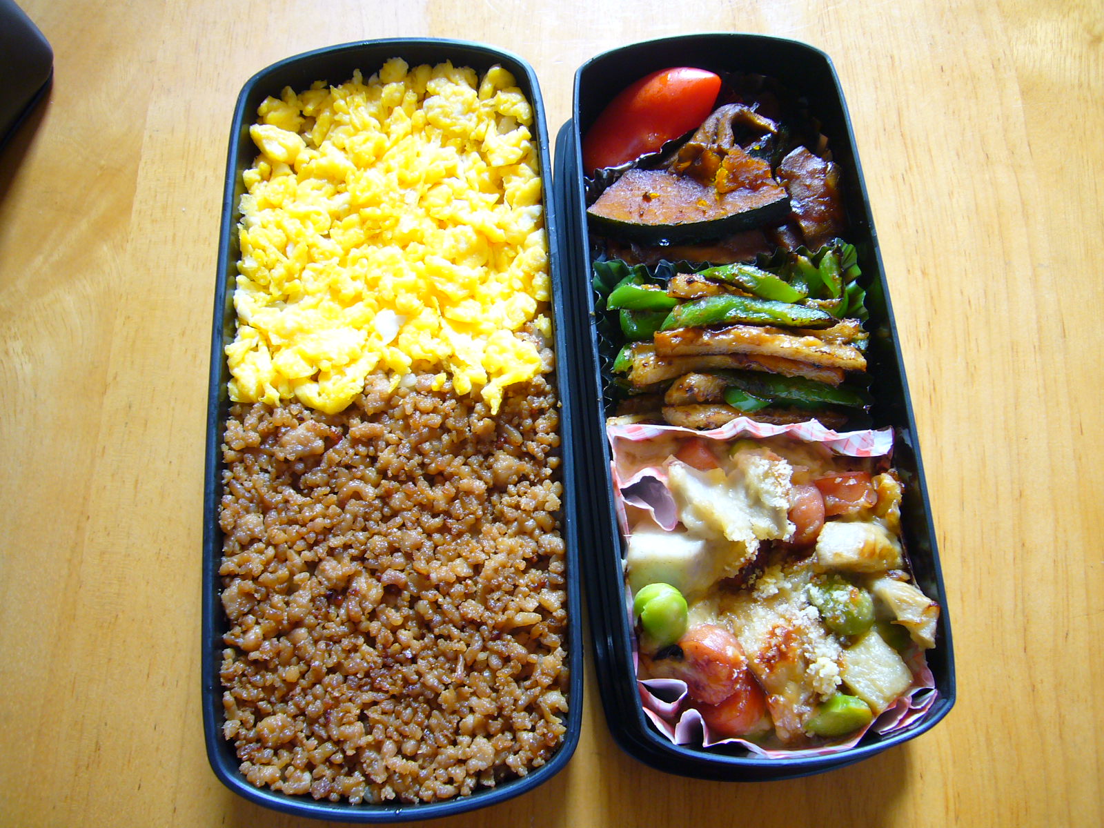 本当は秋刀魚の蒲焼を入れようと思って昨日買ってきたお刺身用の秋刀魚(一匹50円ですが(^_^;))を三枚にさばいてタレにつけ込み、小麦粉をはたいて、フライパンで焼くというようにいつも通り作りました。