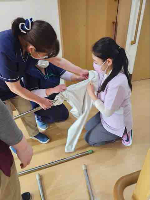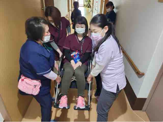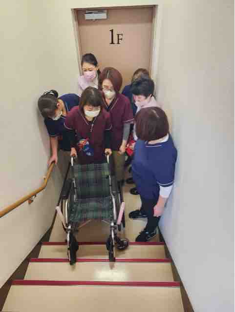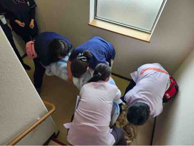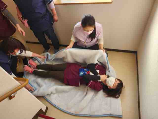 2024年12月29日 18 フォーユー大和郡山🧑🚒災害時の訓練🧑🚒 災害に備えた訓練を実施致しました。地震や水害を想定し、ご入居者の皆様を安全に移動していただけるよう、今回は職員がご入居者に変わって実施致しました。、最初は座学で勉強です。今回は、ご入居の皆様を安全に上の階に誘導する方法をやってみます。1.竿と毛布を使用して担架での移動2.竿と衣服を使用して担架での移動3.車椅子を使用しての移動4.毛布にくるまって頂いての移動を実施致しました。持ち方など沢山の方法を試行錯誤しながら実施致しました。寒さも厳しくなりました。皆様お風邪などひかれませんようお過ごし下さい。