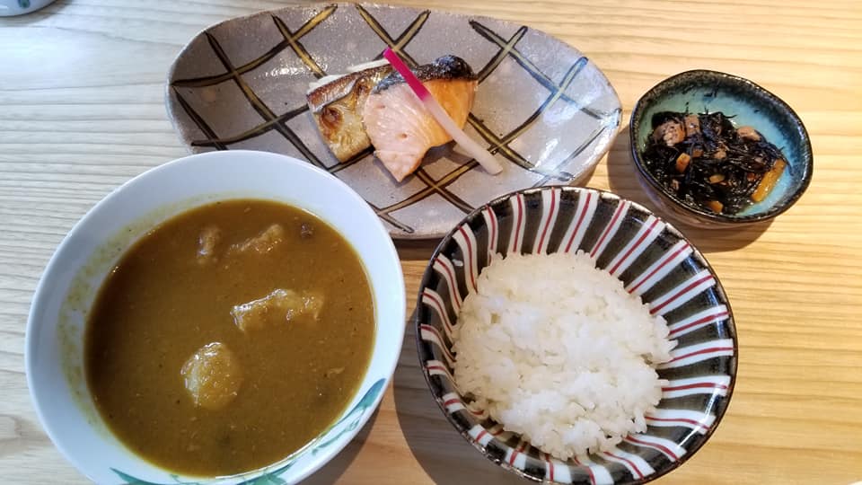 少量のご飯で、焼魚とカレーをいただきます( *´艸`)