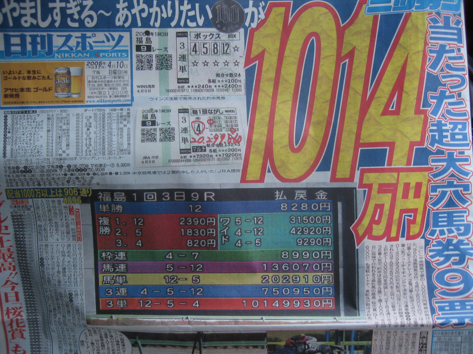 ºòÆü¤ÎÊ¡Å磹£Ò¤Ç¡¢¤Ä¤¤¤Ë½Ð¤Þ¤·¤¿£±£°£°£°ËüÇÏ·ô¡ª¡ª¤³¤Î¥ì¡¼¥¹¡¢¹Ó¤ì¤ë¤ÈƧ¤ó¤Ç¤¤¤¿Êý¤Ï¿¤¤¤È»×¤¦¤Î¤Ç¤¹¤¬¡¢»ä¤ÎͽÁۤϡ¢ºÇ½é£¸Æ¬¤ò¥Ô¥Ã¥¯¥¢¥Ã¥×¤·¤Æ¤Þ¤·¤Æ¡¢£±¡¤£³¡¤£´¡¤£µ¡¤£¶¡¤£·¡¤£±£°¡¤£±£²ÈÖ¤òµó¤²¤Æ¤Þ¤·¤¿¡£¤½¤ÎÃæ¤Ç¡¢·ë¶É£¶ÈÖ¤ò¡ý¤È¤·¤Æ¡¢£µÈ֥ܥ¹¥Ý¥é¥¹¡û¡¢£³ÈÖ¢¥¡¢£±£°ÈÖ¡ù¡¢£´È֥ե塼¥Á¥ã¥®¥ã¥ó¥°¢¤¤È£µÆ¬¤Ë¹Ê¤Ã¤¿Í½ÁÛ¤ò¤·¤Æ¤Þ¤·¤¿¡£ÇÏ·ô¤Ë¥¿¥é¥ì¥Ð¤Ï¤Ê¤¤¤Î¤Ï²ò¤Ã¤Æ¤Þ¤¹¤¬¡¢¹Ê¤êÊý¤ò´Ö°ã¤¨¤Ê¤±¤ì¤ÐÁª¤Ù¤¿¤Î¤Ë¤È»×¤ï¤ì¤ë¤Î¤È¡¢£¸Æ¬£Â£Ï£Ø¡Ê£³Ï¢Ã±¤Ç£³£³£¶Ä̤ê¡Ë¤Ç£±£°£°£°ËüÇÏ·ô¤À¤È»×¤¦¤È¡¢¾¯¤·²ù¤ä¤Þ¤ì¤Þ¤¹¡¦¡¦¡¦¤Þ¤¢¡¢¼¡³«ºÅ¤Î£Ô£Ã£Ë¤Ç´èÄ¥¤Ã¤Æ¸«¤Þ¤¹¤«¤Í¡ª¡ª