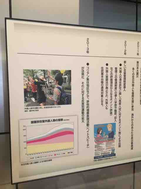 2017年に大規模な展示替えをした国立民族学博物館の展示は”多みんぞくニホン”というテーマで、日本にくらす移民の方々の暮らしを紹介するコーナーで締められていました。そこに展示されている年表は、「2013年 コリアン集住地区などで、排他的憎悪表現活動(ヘイトスピーチ)が活発化 それに対する反差別運動の拡大」という項目で終わっていました。