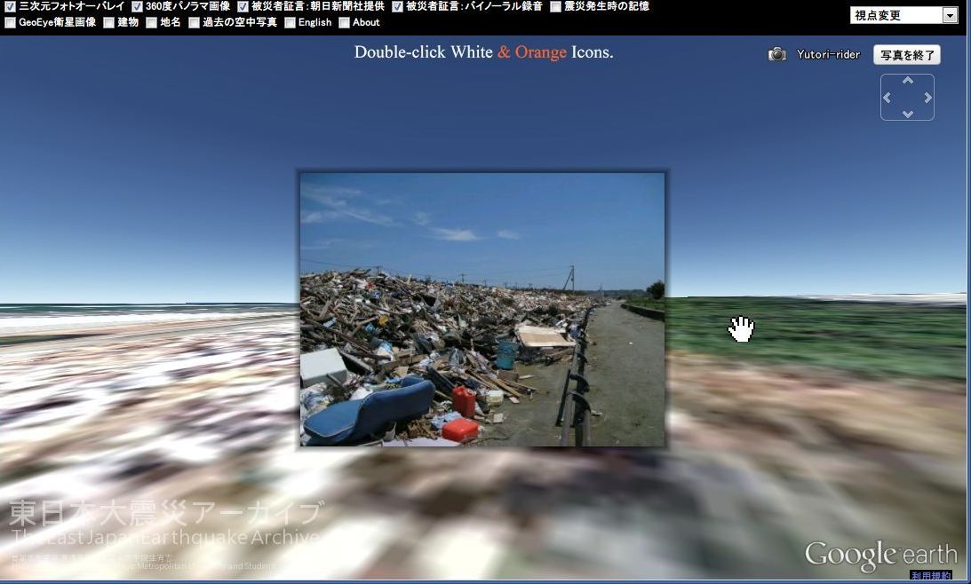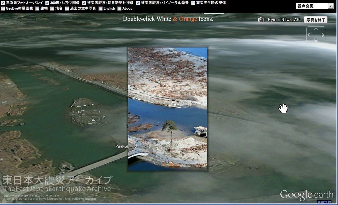 結局Google Earthを作って「はいどうぞ」だと、あまりにもショートスパンのプロジェクトになってしまう。で、東日本大震災のアーカイブのときも、当地出身の宮城大学の学生さんらが現地の方に話を聞いて、載せてくれたりといった活動に繋がっています。