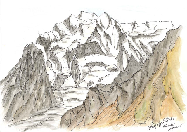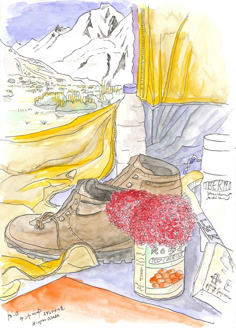 悪天候も災いし、彼らの登頂は成らなかったが、その旅でも私は十数枚の絵を描いた。その時のスケッチも2004年の絵に併せて、今回「カラコルム・スケッチ編」として掲載する。