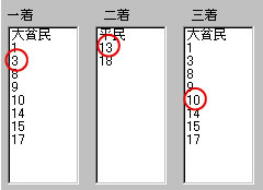 次に自分の選んだ軸馬を確認します。今回は700万馬券の出た昨年の桜花賞を例としてみましょうか。軸にした馬は13番のソ−マジックです。ソーマジックは4番人気なので平民となります。・‥…━━━☆・‥…━━━☆