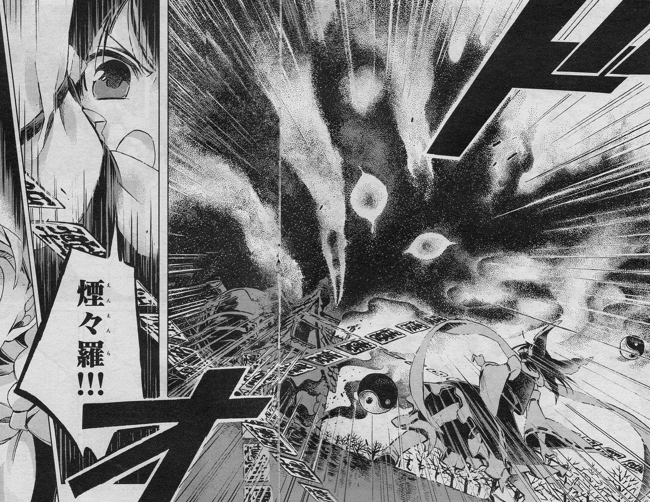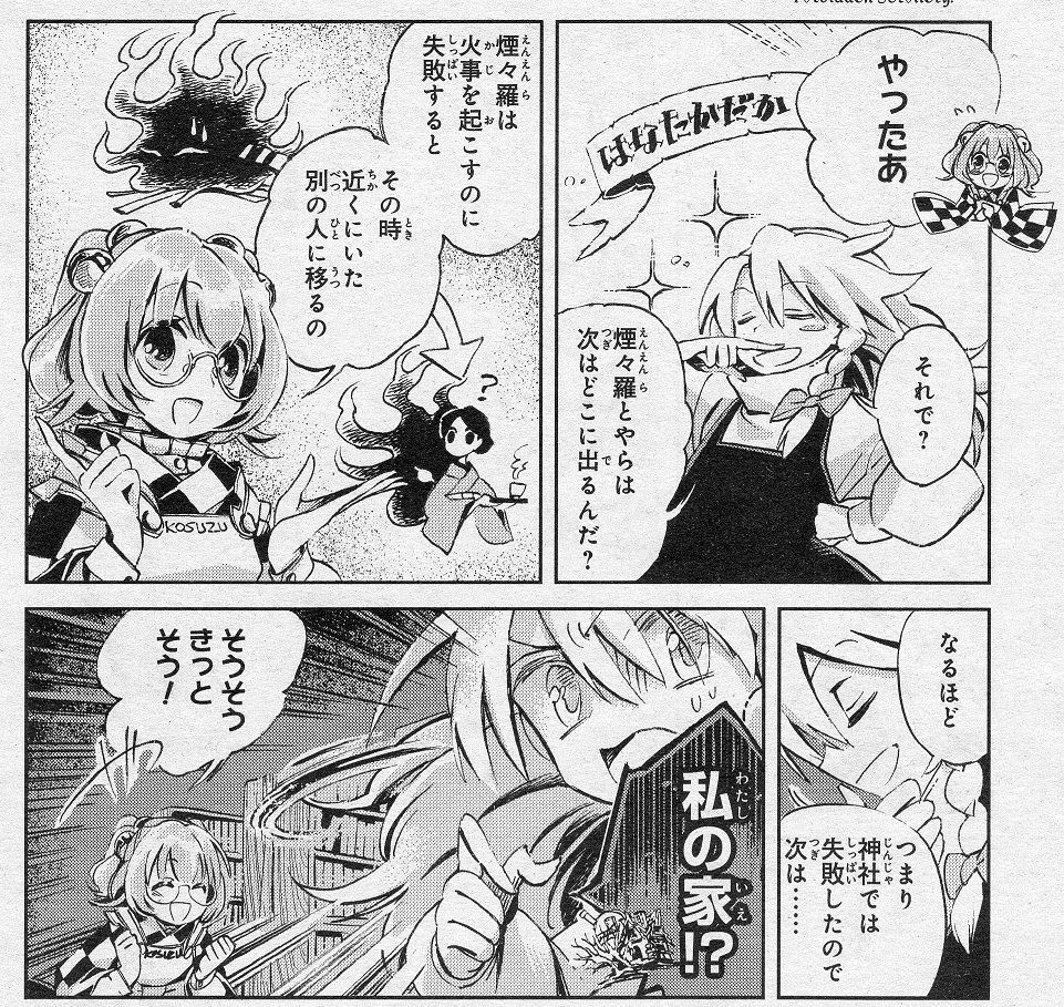 煙に気付かない振りをして家に入り、御札等を貼って浄化するという、霊夢でさえ知らなかった記録の少ない煙々羅の退治方法を小鈴は霊夢に教えます。