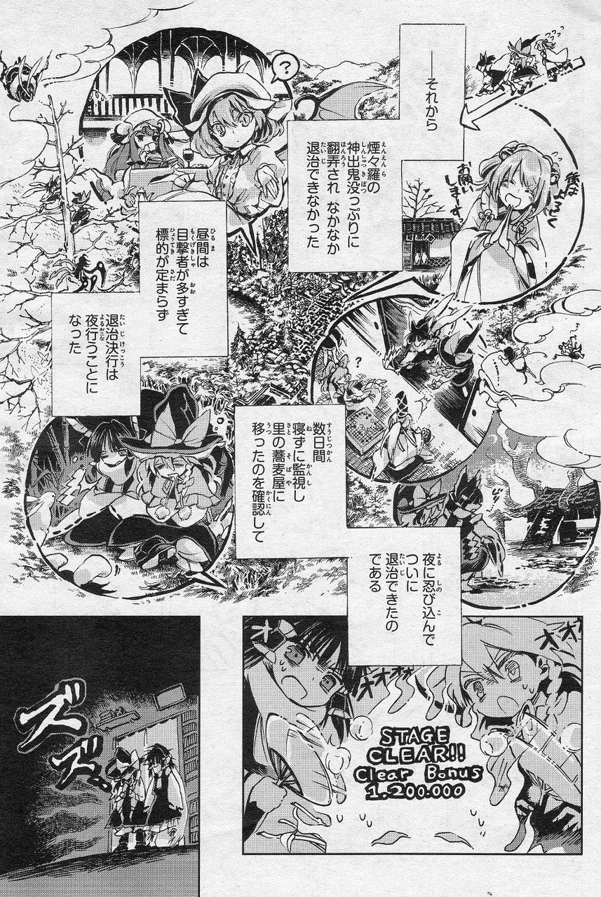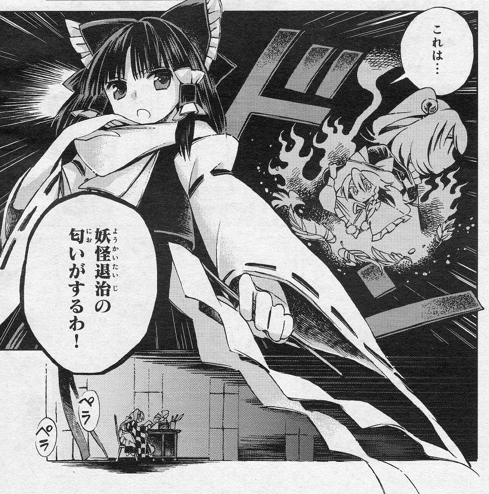煙の妖怪だと感づきいち早く退治した霊夢に魔理沙は「餅は餅屋だな」と調子のいい様子。