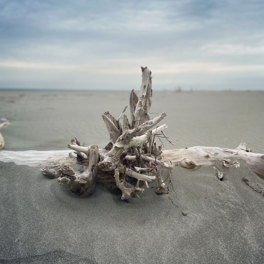 波が無いと、海岸はとても静かで、砂浜に無数に転がる流木が風化した白骨のようで、
