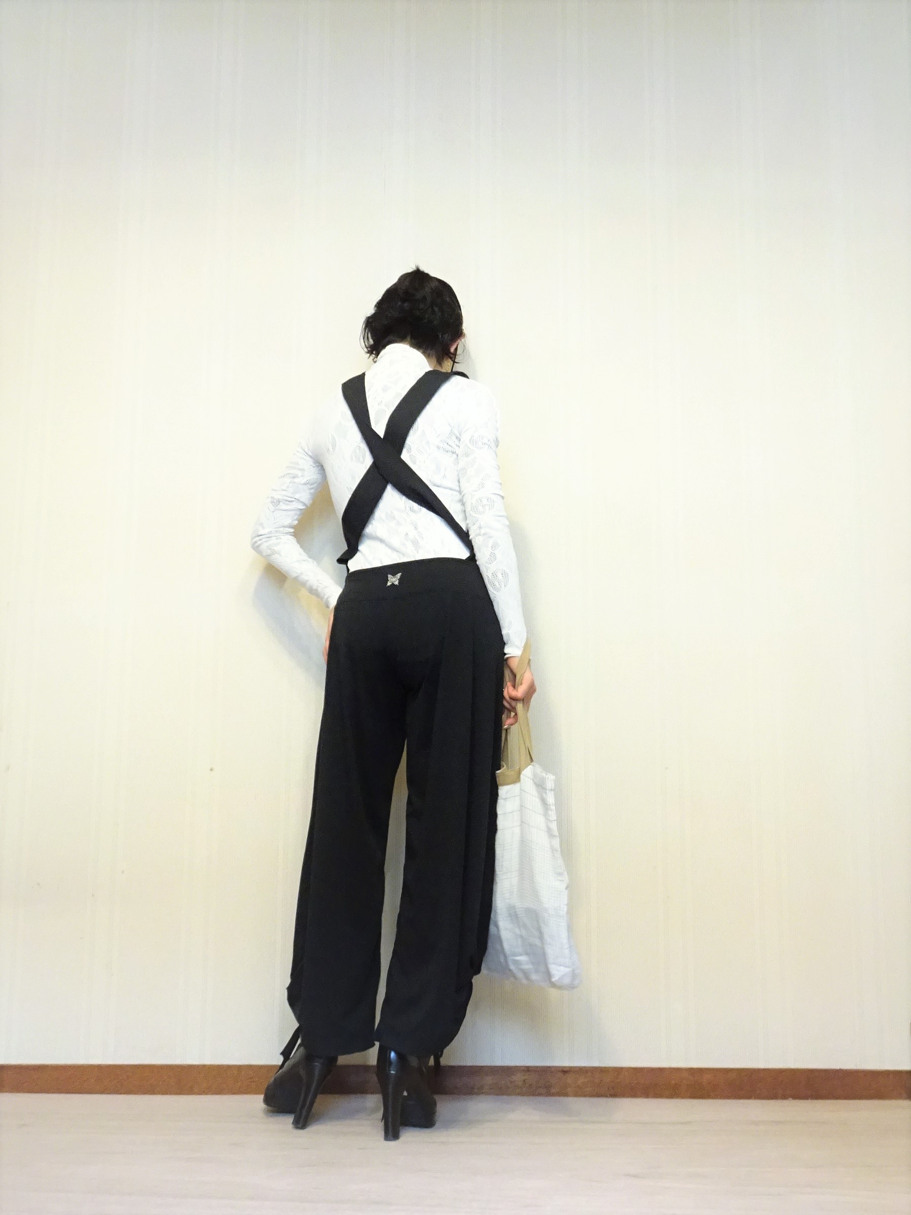 うしろから見ると白いトップスとパンツとで分割されます。