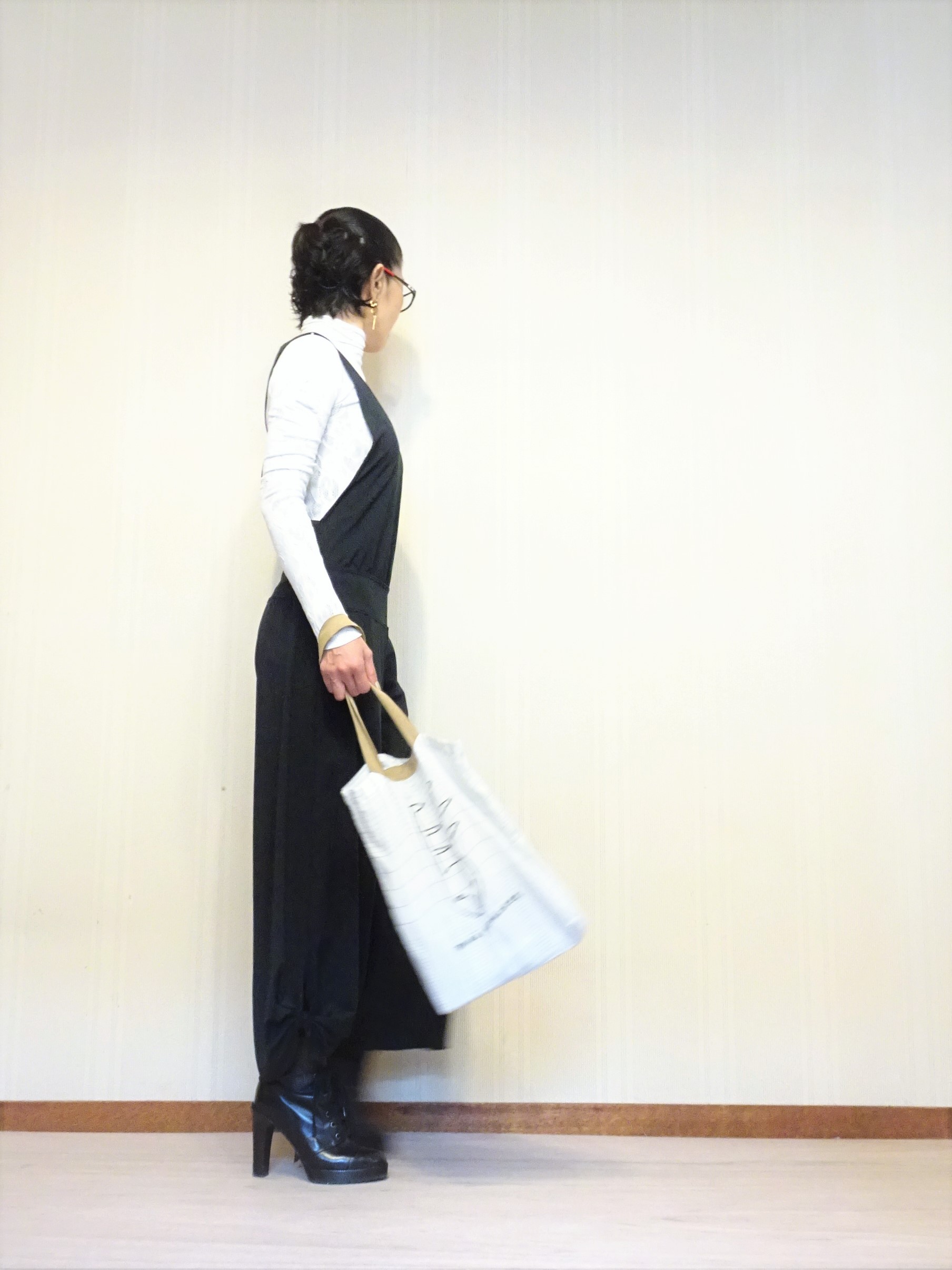 サロペットなので前から見ると縦のラインが強いのですが