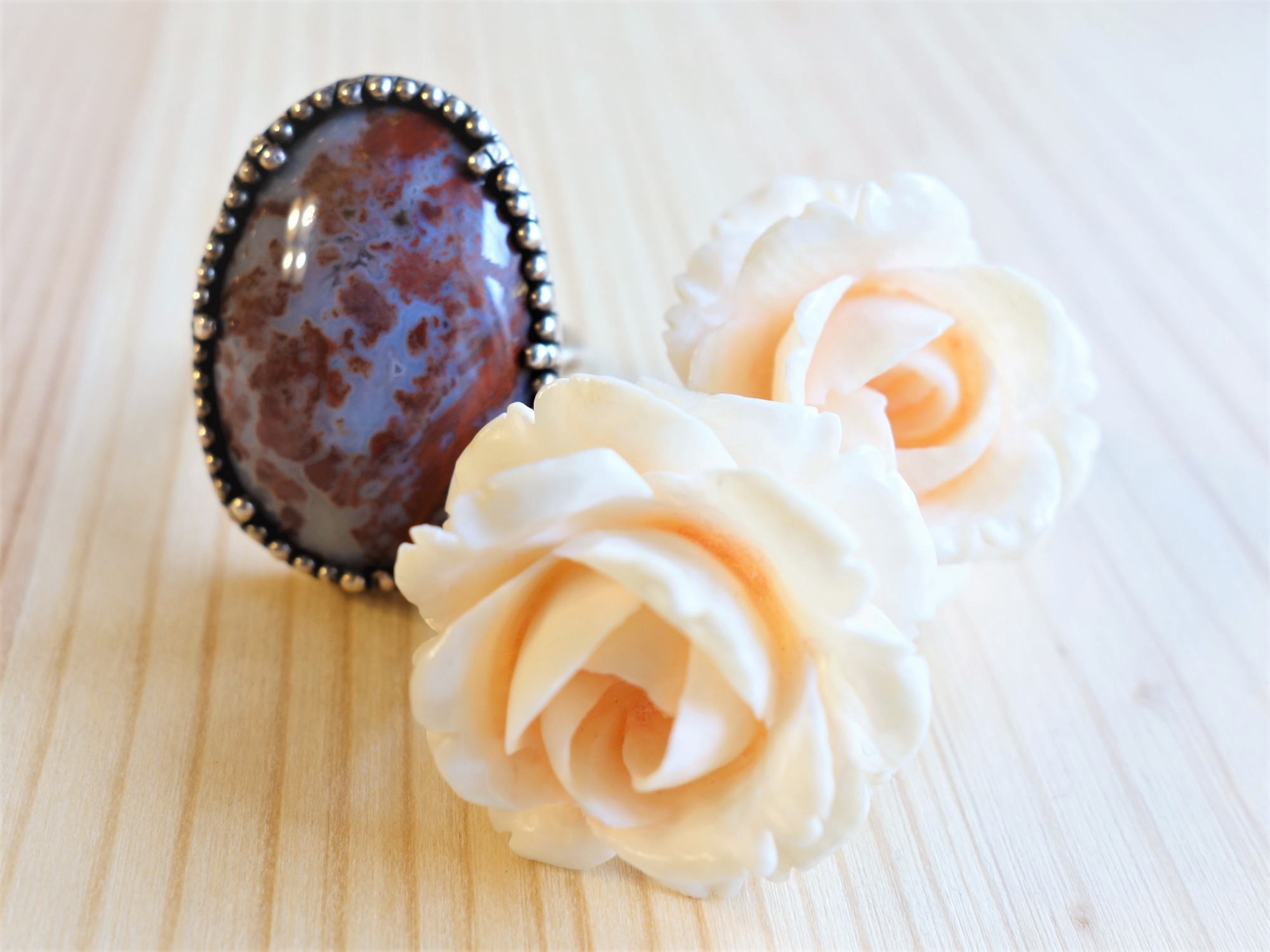 アクセサリーはバッグの白にリンクさせてアイボリーの薔薇~
