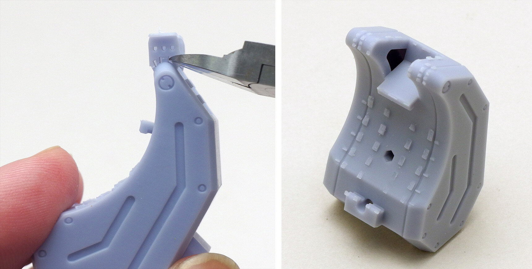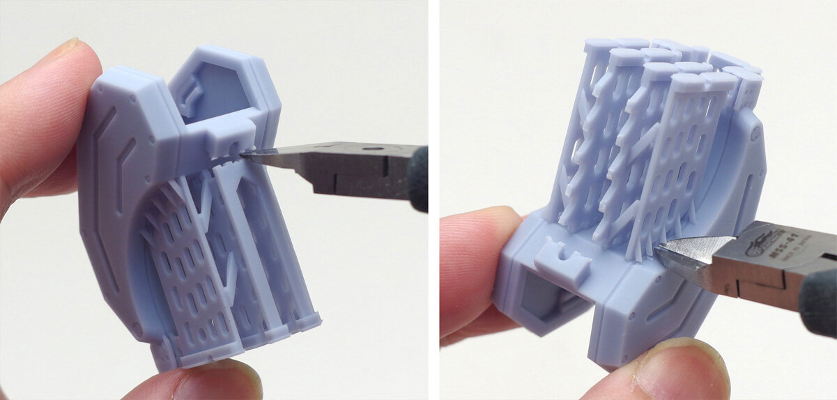 ▲脚部後面につけるパーツは一体成形となっています。板状サポートは、外側からひとつひとつ切り取るようにすすめていきます。右はサポートを切って整えた状態です