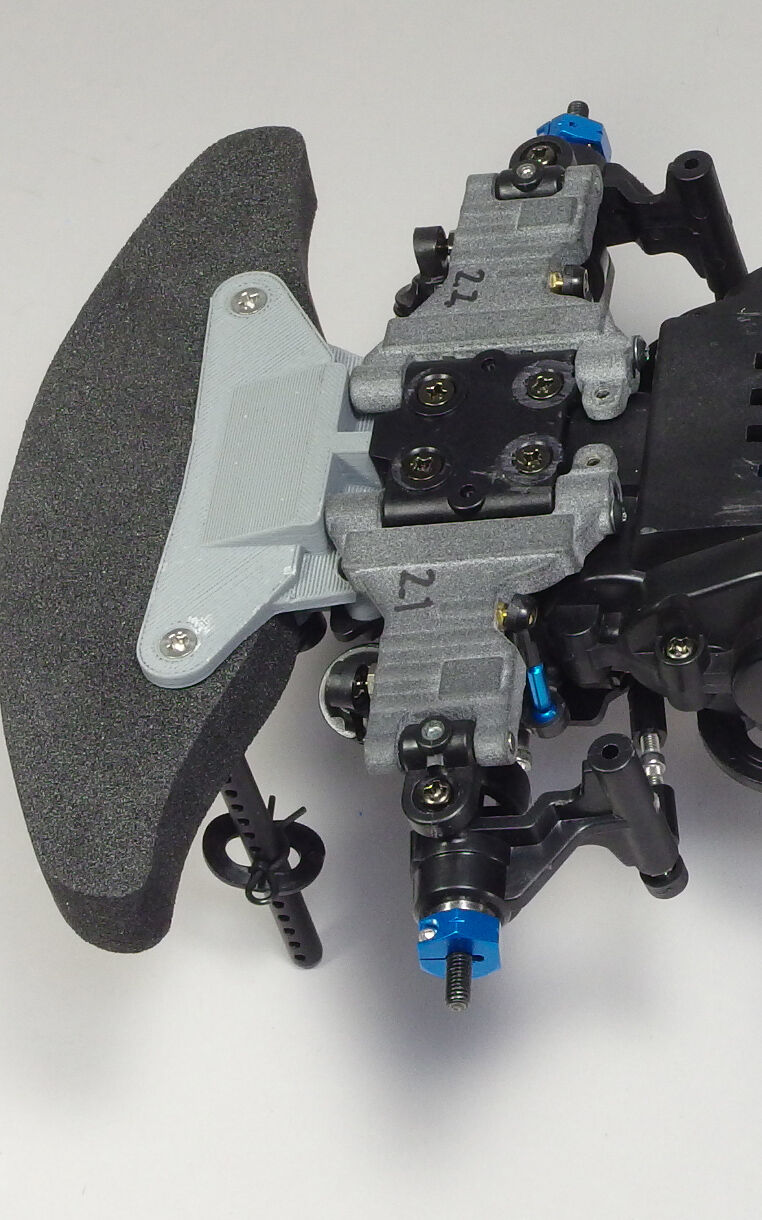 サスプレート部分は「OP.1636 TT-02 TYPE-S スチールサスマウント (フロント)」に交換してリバウンドストッパーが増設できるように、という考えでもあったのだけど、その場合はもっと前方に配置する必要があり、バンパーとの兼ね合いで収めるのが難しかったので、そこは保留。ひとまず現状での機能確認を優先