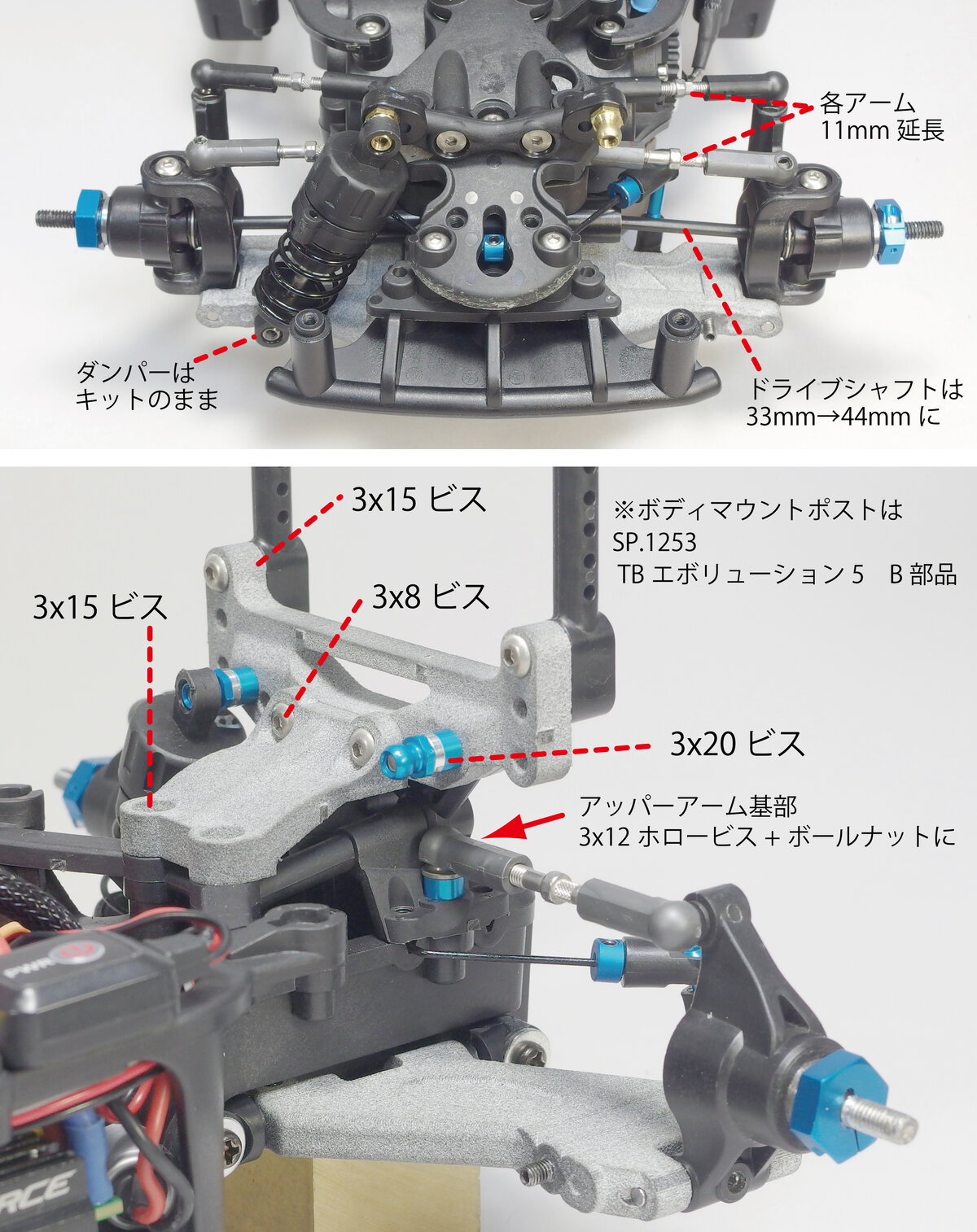 M-07をFFツーリングカーとして改造しているのの続きサスアームのみ拡幅した「手軽なツーリングサイズ化」から、ちょっと走りに振った仕様になってきました。よりタイヤを活かせるように、足回りを一新。