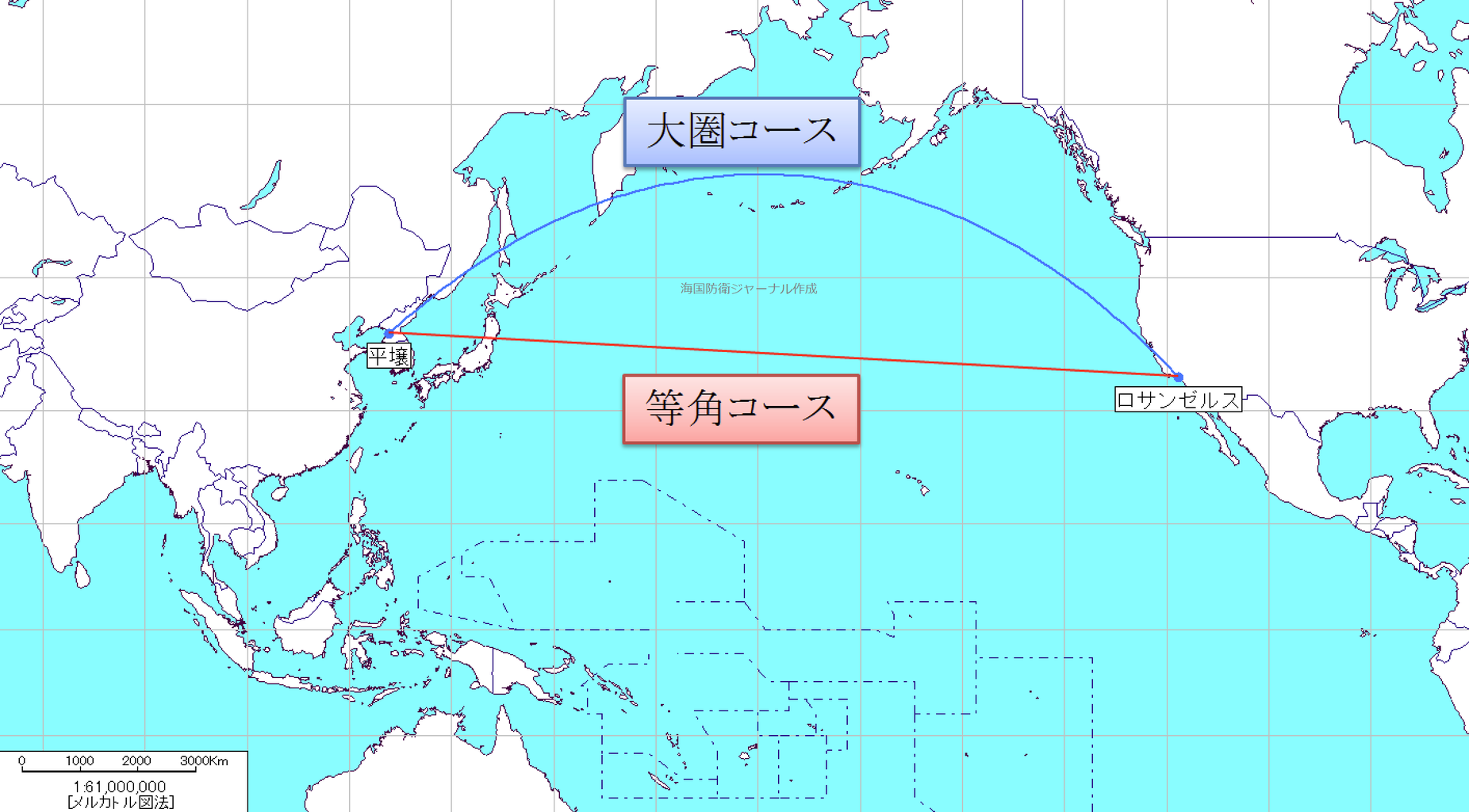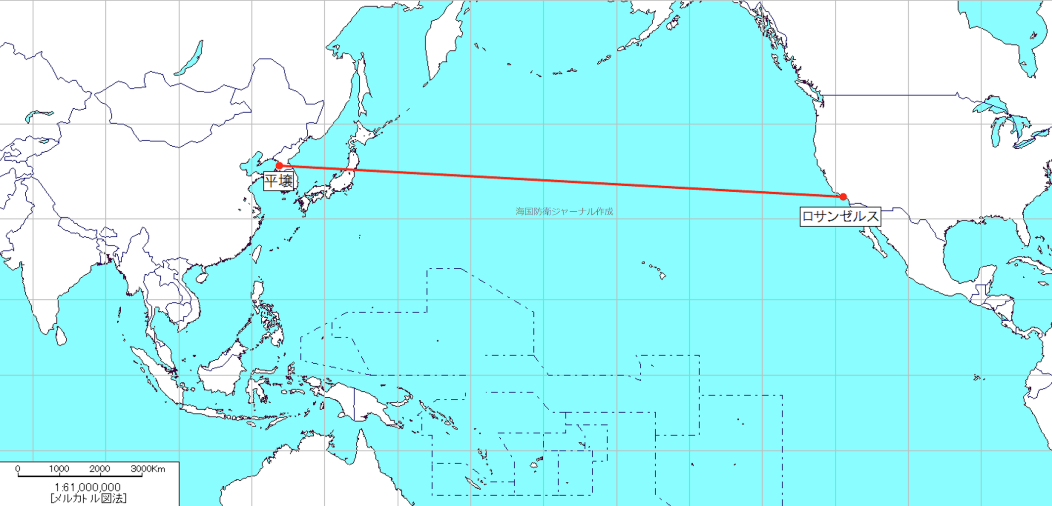 では、本稿の主旨である方位と距離に注目してみましょう。北朝鮮の平壌からロサンゼルスに向かう弾道ミサイルの軌道をメルカトル図法上に描いてみます。