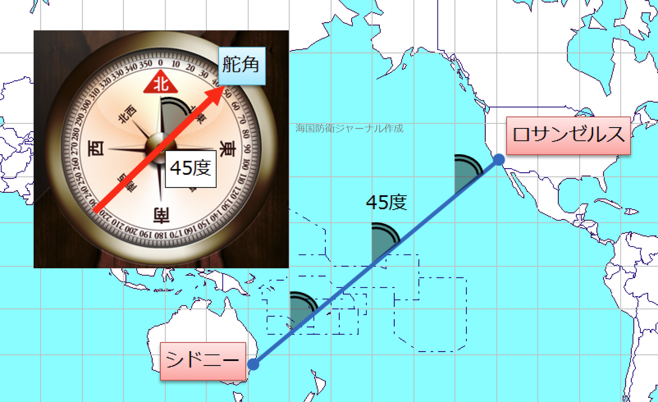 メルカトル図法の適切な利用法は航海図です。シドニー〜ロサンゼルス間の場合、東方向にだいたい45度で経線と交わっているので、実際に船の舵を取るときには、航路の角度(舵角)を北に対して45度に保って東へ向かえば、いずれ目的地に到着することになります(図3)。